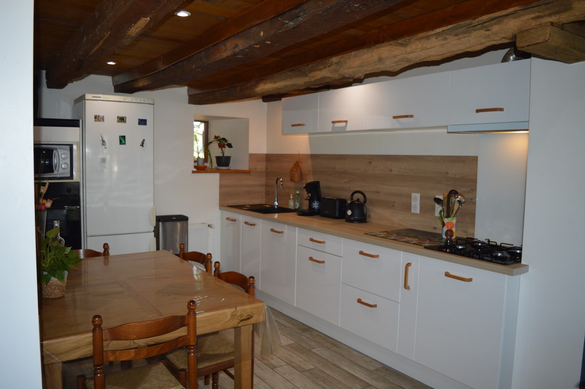 Denne romslige låven, smakfullt renovert, vil fortrylle deg med sin beliggenhet i naturen, i en bevart ramme. Terrassen på 28 m² gir en unik utsikt over skogen, og man blir vugget av lyden av bekken nedenfor. Her er det ingen TV, men bøker. Hver detalj er nøye gjennomtenkt, alt er brukt. Denne boligen på 112 m², fullt utstyrt, med 2 dobbeltrom, en stor stue med peis, en vakker hage, er et sted hvor tiden er stanset. Ingen naboer i nærheten.