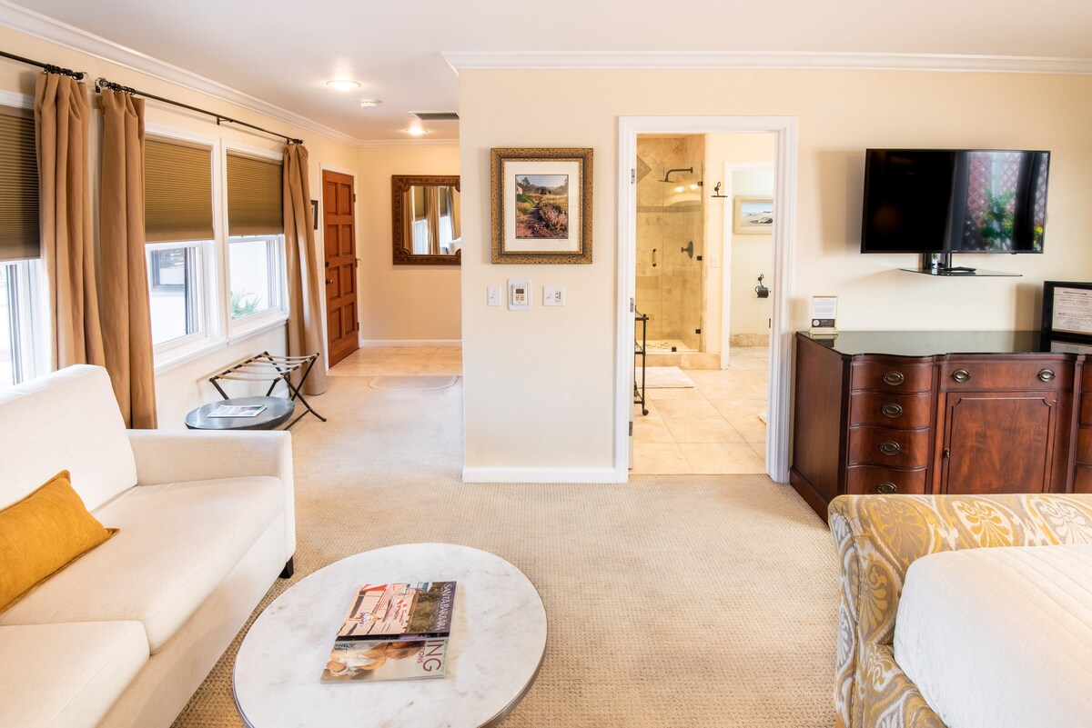 Disse stilige, nyoppussede suitene med king-size-seng ligger på vår elegante gårdsplass med elegante bålplasser og sitteplasser i loungen. Omfavnelse av det danske konseptet med hygge, varme og velvære - tilbyr denne suiten et virkelig innbydende tilfluktssted. Inne kan du nyte dansk-salifornisk innredning og moderne bekvemmeligheter, inkludert mikrobølgeovn og minikjøleskap. For en fredelig utflukt kan du slappe av i den frodige bakhagen med sitt rolige lysthus og peis - bare en kort spasertur fra Solvangs sjarmerende butikker og spisesteder.