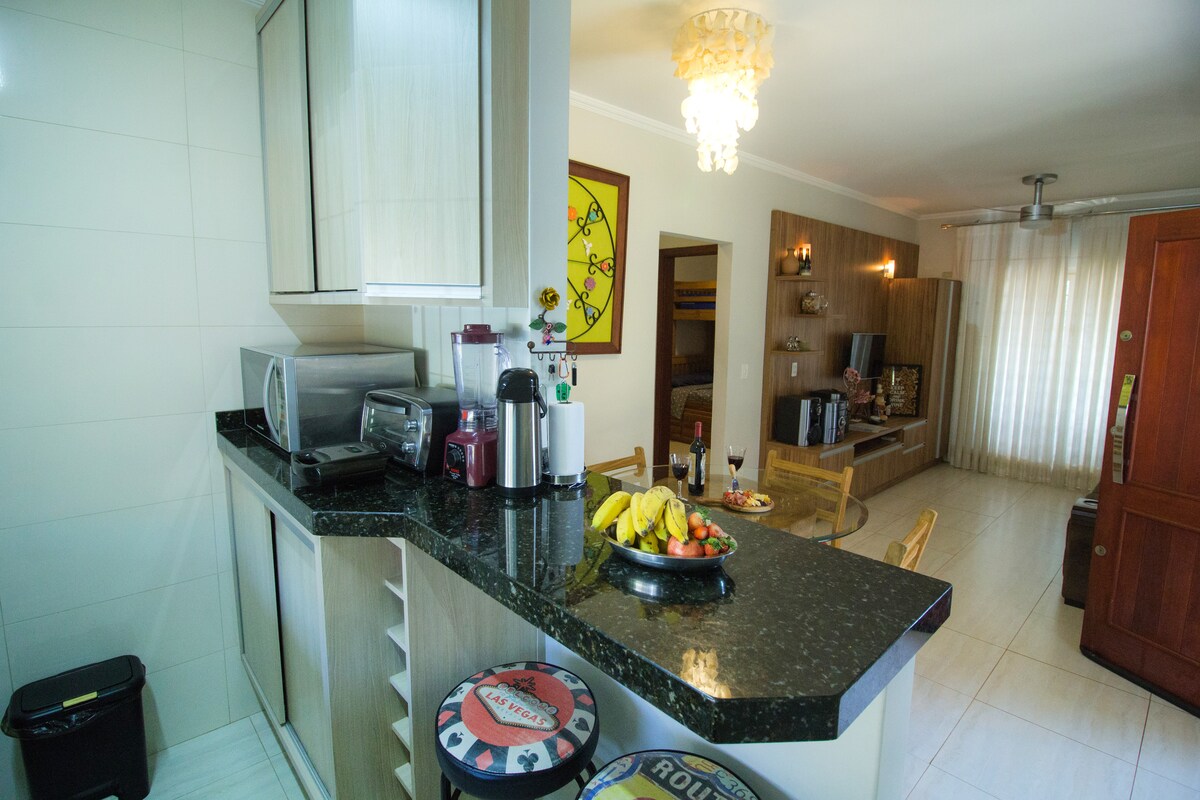 Entire 110 m² apartment, spacious, comfortable and full of personality. It combines the coziness of grandma's house with a contemporary touch. Panoramic view of the basilica. Spacious rooms, ideal for families, couples or groups seeking comfort, charm and a sense of home. Quiet and relaxing. Furnished with all amenities, covered parking and right in the city center, close to markets, banks, restaurants and shops. Smart TV with Telecine/HBO Netflix and Globoplay. Washer and dryer.
