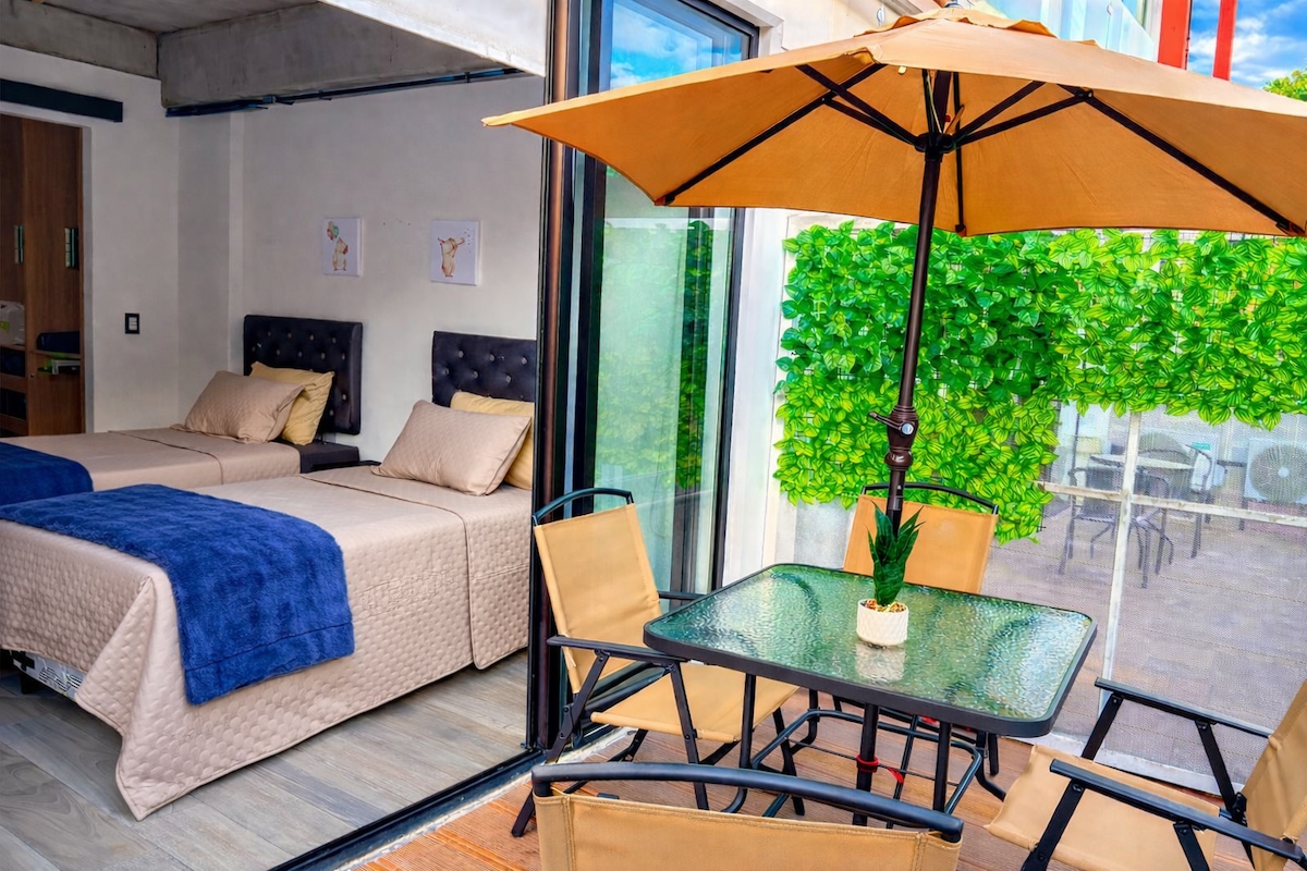 Velkommen til tilfluktsstedet ditt hjemmefra! Denne leiligheten er ideell for par eller små grupper på opptil 3 personer. Den har en komfortabel køyeseng, dobbeltseng og imperial seng; frokostbord, komfortabel stue, lite kjøkken, slik at du kan tilberede favorittrettene dine; komplett bad, privat parkering for opptil to små eller mellomstore kjøretøy og en privat pergola utendørs. Alt er godt opplyst. Beliggenheten ligger i nærheten av Pradera Concepción og andre kjøpesentre.
