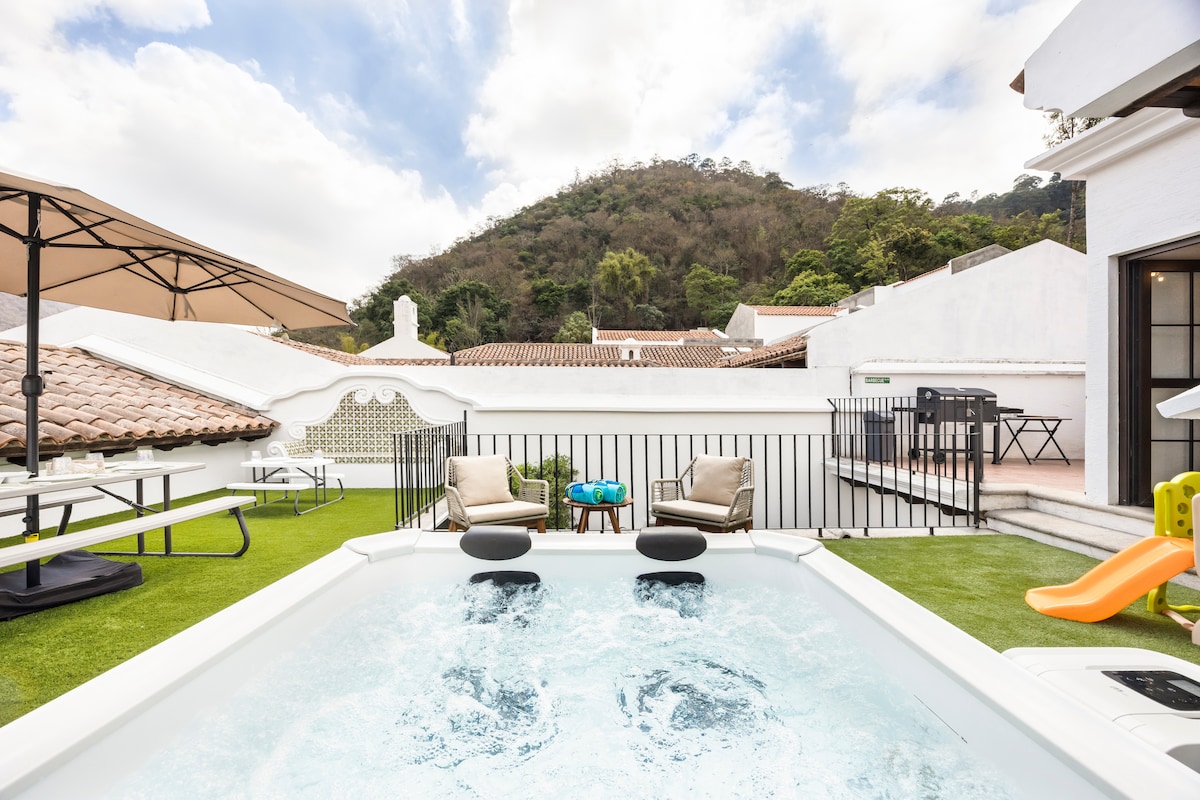 Nyt et komfortabelt og fredelig sted, perfekt for å tilbringe kvalitetstid med familien, som ligger i en eksklusiv privat leilighet mindre enn én kilometer fra det historiske sentrum i Antigua Guatemala. Fra huset kan du gå til Central Park på omtrent 15 minutter. Leiligheten har privat sikkerhet døgnet rundt, en lekeplass, gateparkering på stedet og romslige grønne områder for å slappe av og nyte omgivelsene.