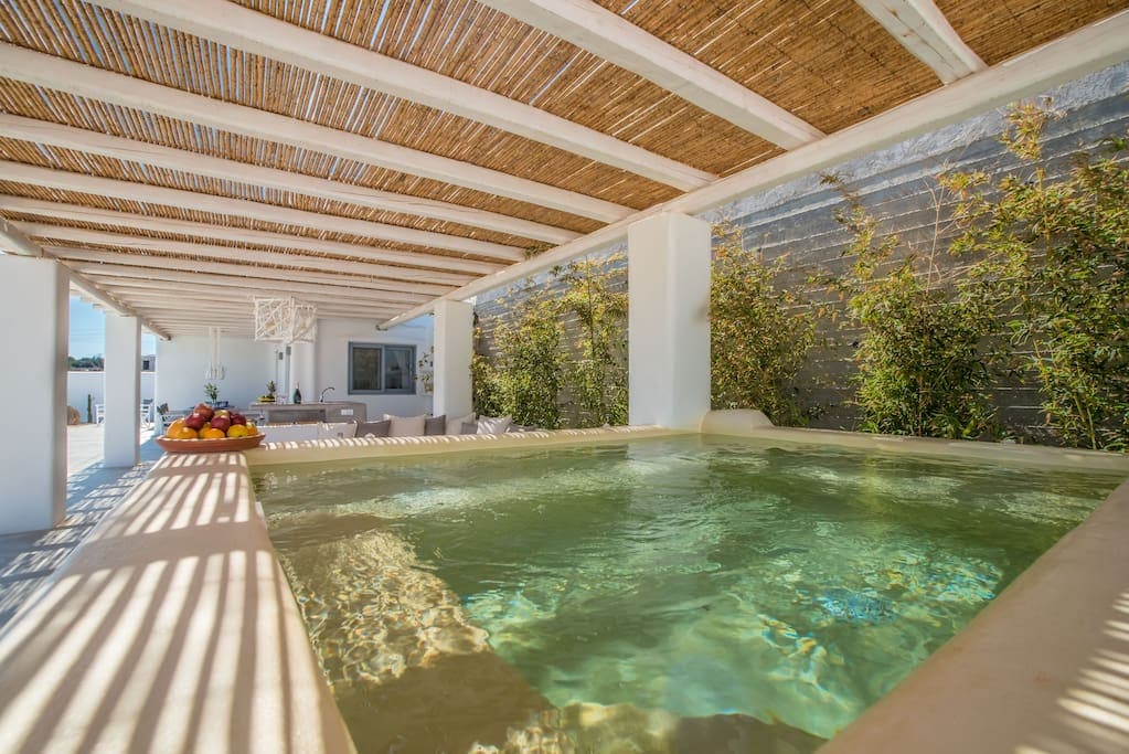 Denne eksklusive boligen ligger i den sjarmerende byen Naousa på den pittoreske øya Paros, og skiller seg ut som den eneste boligen i nabolaget som kan skryte av et privat basseng. Denne boligen tilbyr et luksuriøst tilfluktssted, slik at gjester kan fordype seg i den fredelige skjønnheten til Paros, samtidig som de nyter komfort og avslapning. Det er en ideell ramme for dem som søker en minneverdig og idyllisk ferieopplevelse på denne fortryllende greske øya.