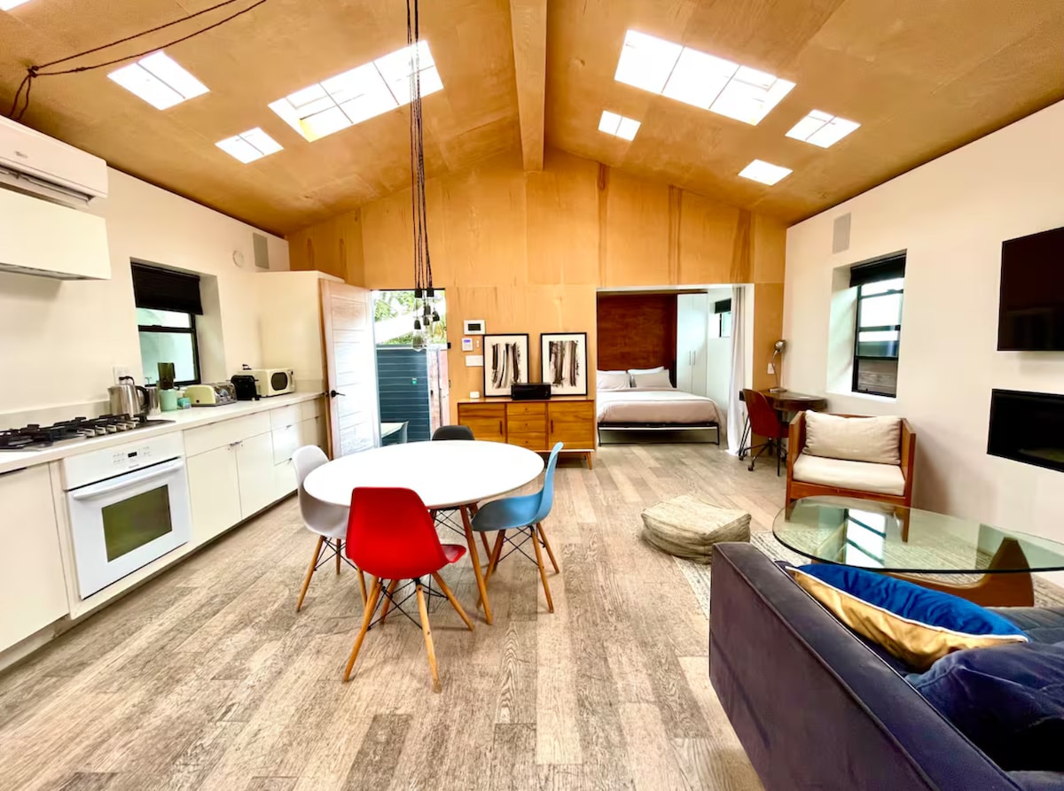 Vårt gjestehus i loftsstil er et fristed, moderne eleganse og chic Serenity som ligger i hjertet av Santa Monica. Dette retreatet i Zen-stil ligger blant tretoppene, og har høyt tak, et tak og store vinduer som slipper inn mye sollys hele dagen. Slapp av på den romslige terrassen komplett med 2 komfortable stoler og ottomaner, sug i vårt dype badekar med sterkt dusjhode og slapp av med Premium TV-apper. Nyt gratis strandstoler og fargerike håndklær for en dag på stranden.