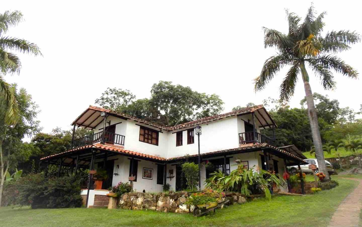 Stort, trygt, stille hus og hytte med store hager, utsikt over landskapet og spektakulære solnedganger. Fire soverom med privat bad og vifte, villa i to etasjer med klimaanlegg, bad og vifte. Svømmebasseng for voksne og barn, sklie, grill, volleyball-/fotballbane, spillbord, hengekøyer, leirbål og fugletitting. Stort utstyrt kjøkken, spisestue, stue med 65 tommers smart-TV og surroundlyd. Trådløst nettverk og privat parkering. 25 km fra Bucaramanga, 3 km fra flyplassen og 50 km fra Topocoro-reservoaret.