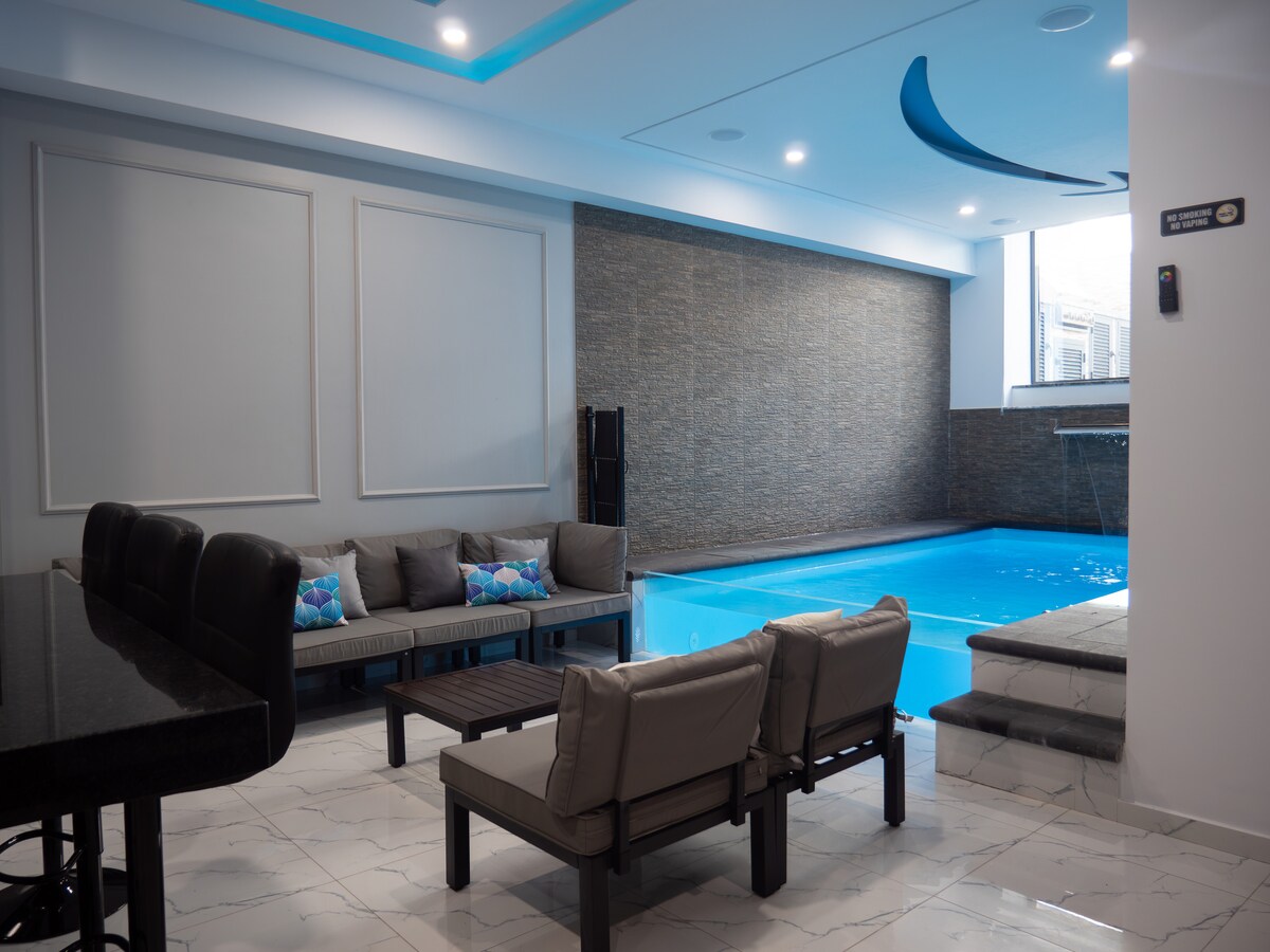 TOPPNIVÅBASSENG, i Cidadela, Praia: en unik opplevelse som kombinerer design og ultimat komfort. Tre raffinerte soverom, inkludert en master-suite, lyst åpent område, klimaanlegg på hvert rom, privat svømmebasseng som inviterer deg til å slappe av, grill, spill for unge og gamle, Alexa, ultrarask Starlink-internett. Nattvakt, kodeinngang. En moderne kokong for uovertrufne minner under Praia-solen!