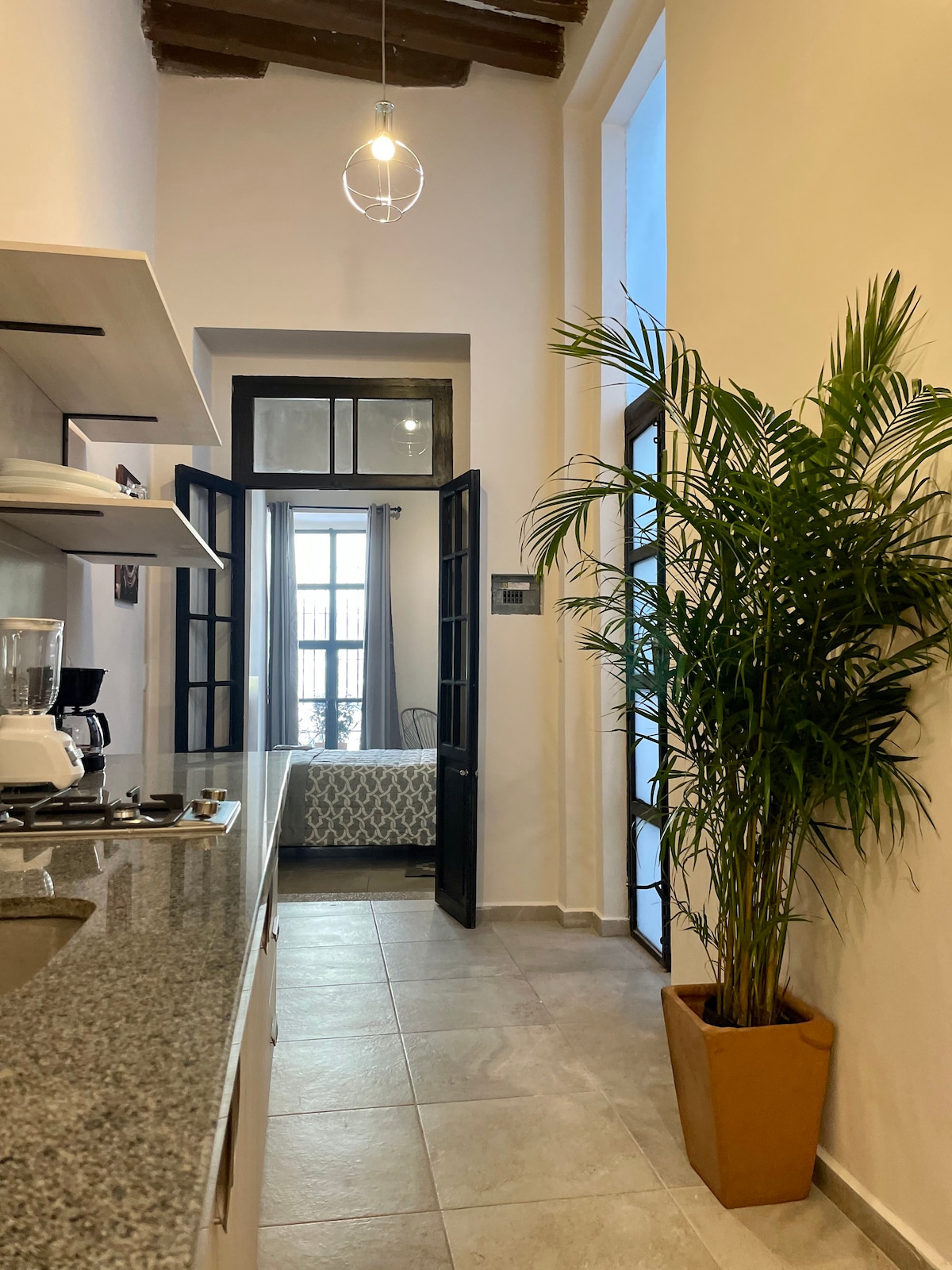 – Privat rom med arbeidsplass og personlig skrivebord (24,9 m2). – privat wifi-ruter med ethernet-tilkobling + overspenningsvern for alle enheter – Privat bad med dusj. – Delt terrasse, tilgjengelig for andre gjester (28,1 kvm). – fullt utstyrt kjøkken, pluss alle nødvendige fasiliteter – sikkerhet døgnet rundt – Ideelt for å besøke det vakre koloniale sentrumsområdet, ti minutters gange fra Jardín Zenea, Plaza de Armas osv. – Rolig og trygt nabolag. – fullstendig renovert studioleilighet