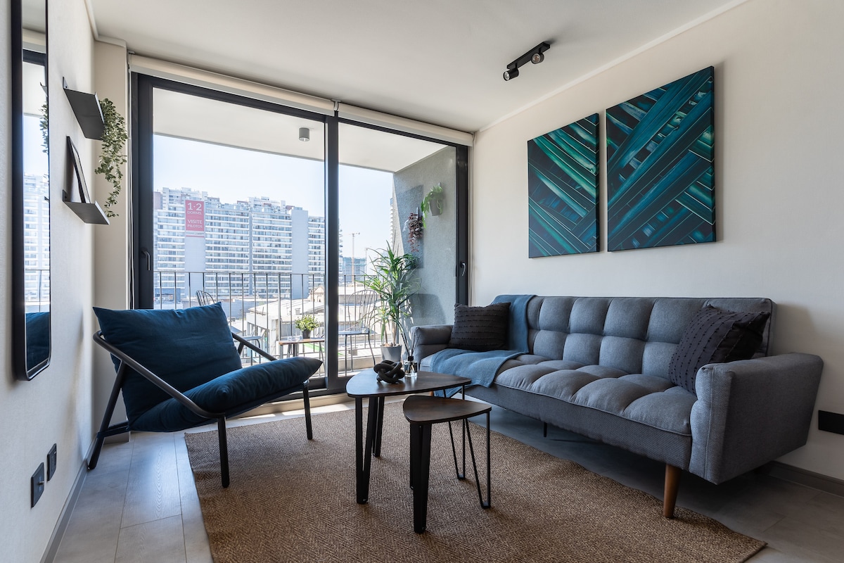 Strategisk 📍 beliggenhet: Det blir veldig enkelt å planlegge besøket ditt!. Hovedfunksjoner: 🏠 Fullt utstyrt for 1 til 3 gjester, 9. etasje 🚇 A pasos del Metro Irarrázaval 🔑 Innsjekking uten vert 🌬️ Klimaanlegg og varme 🛏️ Queensize-seng med førsteklasses madrass 🛋️ Sovesofa 🧴 Håndklær og laken er inkludert. Treetasjes 💪 treningsrom 🏊 Basseng tilgjengelig i sesongen november til mars. To timers skift. 📺 Smart-TV på soverommet. 🚗 Undergrunnsparkering er inkludert. Maksimal høyde er 2,1 meter.