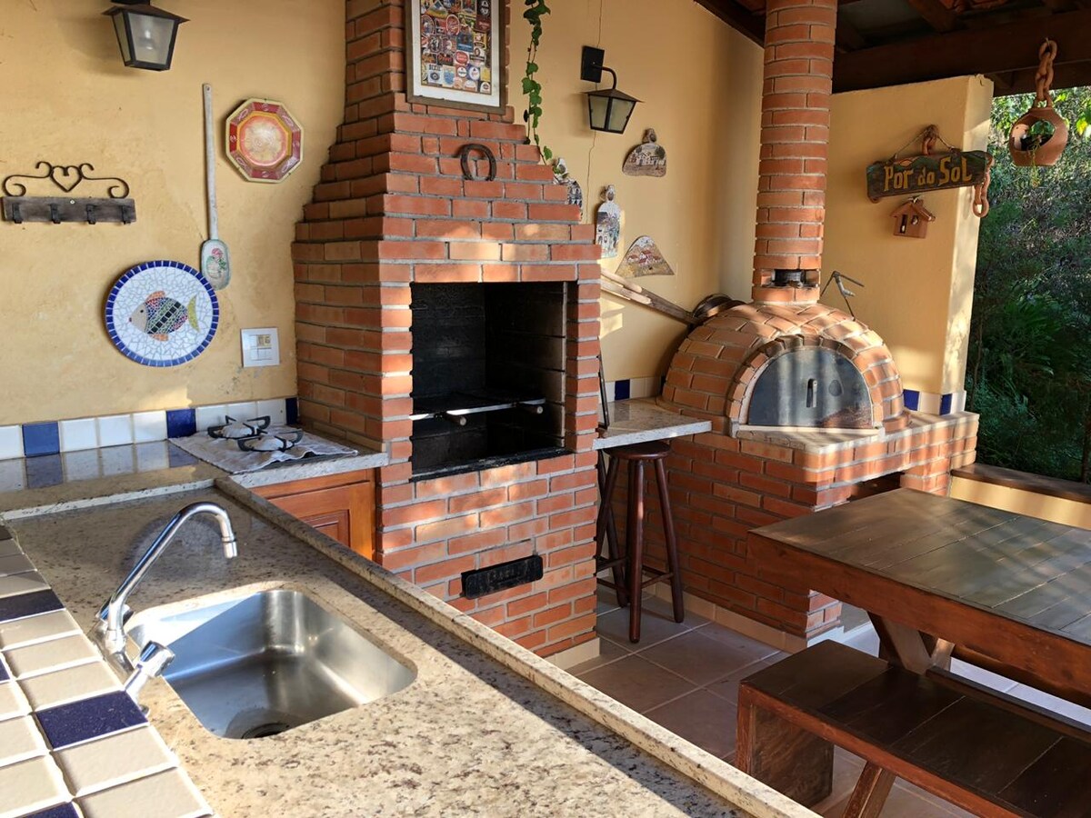 Hus med tre soverom, ett med eget bad, sosialt bad og toalett. Amerikansk kjøkken, peisrom, stue, spisestue, grill, pizzaovn, balkong, meditasjonsplass og kabel-TV. Leilighet med port, mye natur, et lysthus, privatliv og sikkerhet. Internettilgang via trådløst nettverk (15 MB) for hjemmekontor. Rengjøring utføres i henhold til rengjøringsrutinen for covid-19.