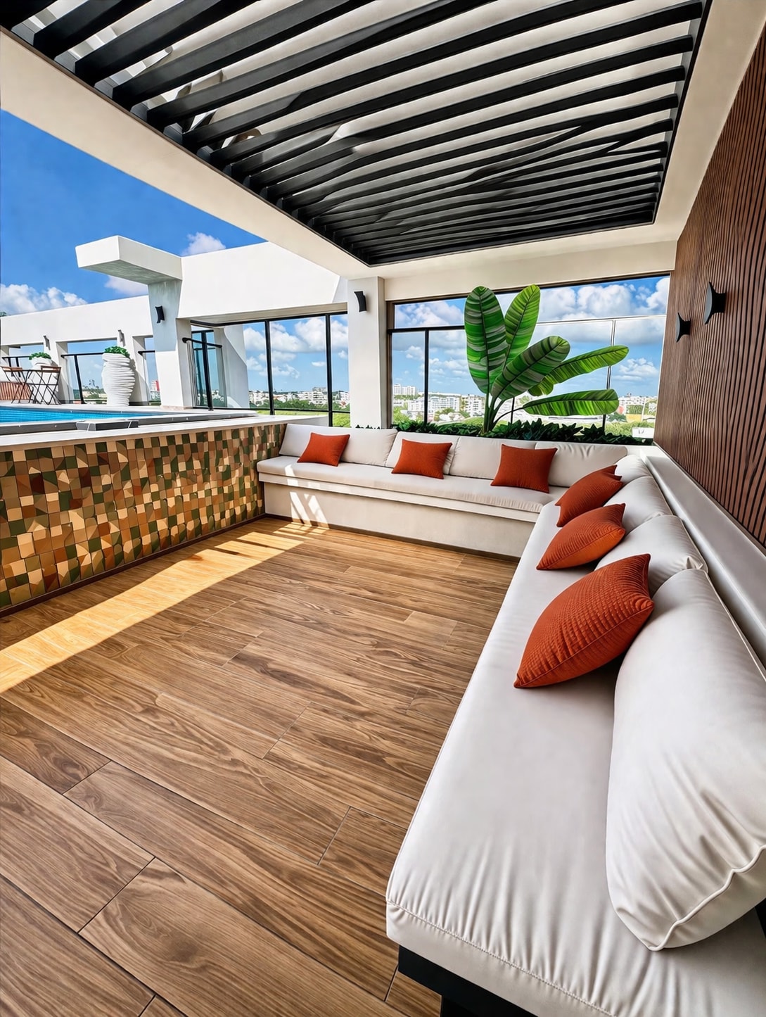 Privilegiada, cotizada y muy codiciada zona del malecón. Impresionante vista al Mar Caribe ! 62 m² de construcción; seguro, intimo, elegante, decorado con simplicidad, y elegancia moderna. Todo lo necesario para una cómoda estadía corta o larga. Internet full, cómodo colchón, cocina equipada, área de trabajo, estacionamiento privado y seguro Servicio de lavandería y delivery, fácil acceso a transporte público y privado. Cerca: Aeropuerto Internacional y la famosa playa de Boca chica