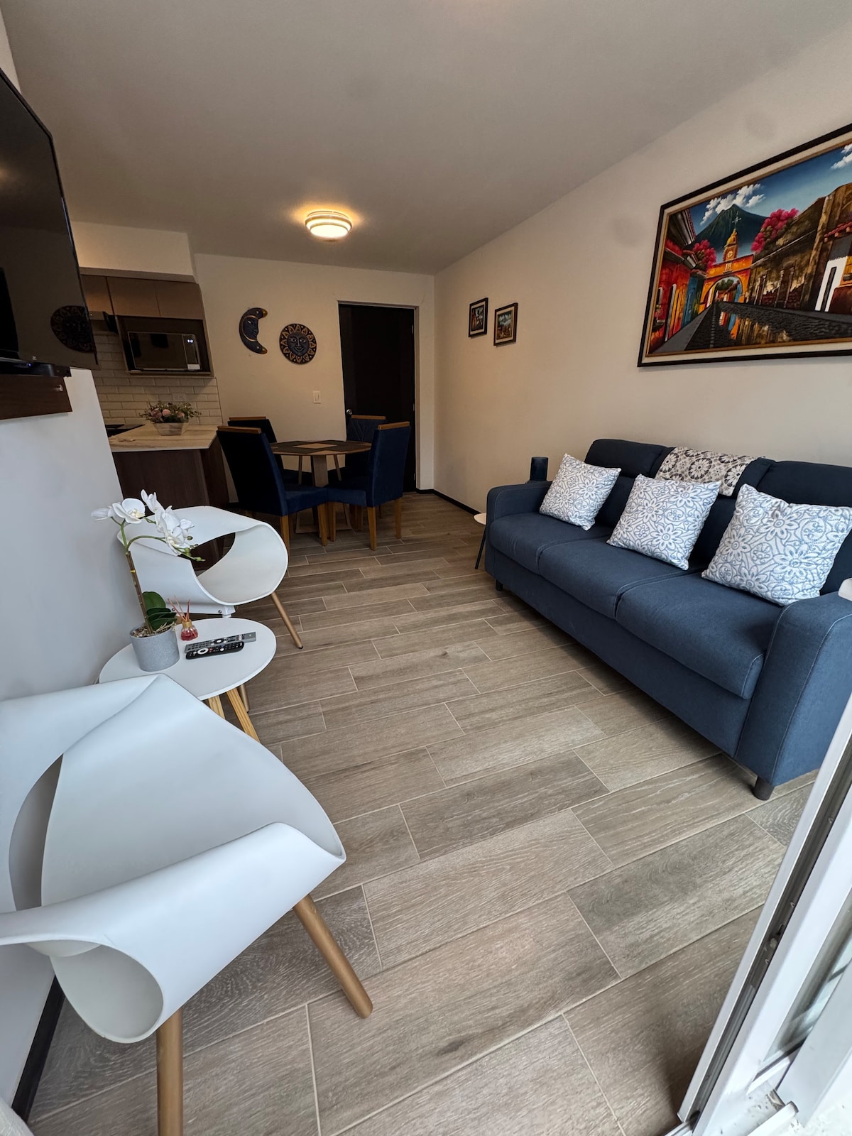 Nyt roen i den koselige leiligheten vår, bare ti minutter fra Antigua Guatemala. Omgittet av natur, byr den på fantastisk utsikt over vulkanene, og skaper en atmosfære av fred og avslapning. Med et fullt utstyrt kjøkken kan du nyte favorittmåltidene dine mens du fordyper deg i skjønnheten i omgivelsene. Oppholdet ditt her blir uforglemmelig!