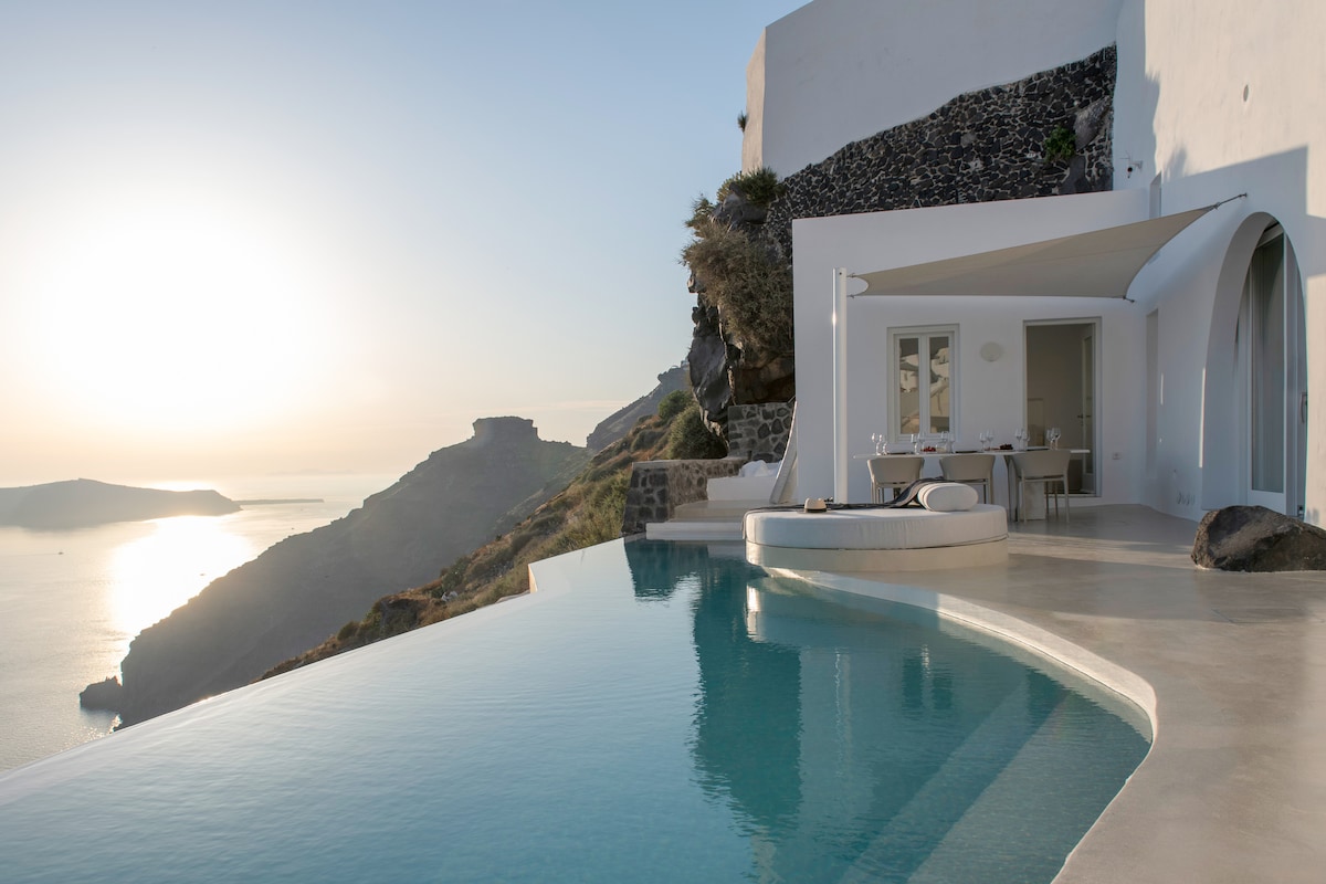The quintessential rock, sea and sky of the Greek islands appear in all their glory at Villa Etheras. This cliffside Santorini vacation rental was named for ether, believed by the ancient Greeks to be the mystical fifth element from which the world was created along with air, fire, earth and water—and, in their mythology, the pure air breathed by the gods. When you sample its panoramic views, gorgeous terrace and chic interiors, you may enjoy a spiritual experience, too. Set into the rock of the hillside, the villa’s private oceanfront terrace commands views over the caldera and along the coast. Gather around the shaded dining table, stretch out on a seat in the sun or cool off in the infinity pool, which features a lounging platform that appears to be floating on the water’s surface. Inside, a TV, sound system, DVD player, Wi-Fi and air conditioning round out the amenities at this luxury property. The white stucco walls so characteristic of the islands are carried into Villa Etheras, where they wind around an open-concept living room and kitchen. A sleek fireplace surround and polished marble coffee table contrast with the soft slipcovered sofa in the living room; in the fully equipped kitchen, a rock slab is a rugged counterpoint to the minimalist cabinets and breakfast bar. The villa’s two bedrooms are the perfect size for a small family or two couples on holiday together—or even for an indulgent honeymoon in the Santorini sun. Both bedrooms have king beds, en-suite bathrooms and sea views. With a location in the quiet village of Firostefani, Villa Etheras is a short drive from the larger town of Fira and scenic, unpretentious Exo Yalos beach. When it’s time to leave your island retreat, plan on a 7-mile drive from the villa to the ferry docks at Athinios Port Santorini. Copyright © Luxury Retreats. All rights reserved. BEDROOM & BATHROOM • Bedroom 1: King size bed, Ensuite bathroom with shower/bathtub combo, View of the sea • Bedroom 2: King size bed, Ensuite bathroom, Rain Shower, Television, View of the sea FEATURES & AMENITIES • More under “What this place offers” below OUTDOOR FEATURES • View of the caldera • More under “What this place offers” below STAFF & SERVICES Included: • Daily housekeeping • More under “What this place offers” below Extra cost (advance notice may be required): • Activities and excursions • More under “Add-on services” below