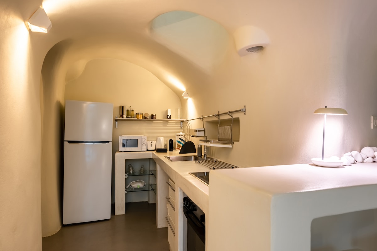 Kingsuiten i maisonettstil er skåret inn i de vulkanske klippene, og har sitt tradisjonelle Santorini canava-område*, som utgjør det ultimate kykladiske skjulestedet. King Suite åpner seg inn i et hjem i åpen planløsning som viser frem sin gamle vinsjarm, og har en stilig stue med nydelige detaljer i innredningen fra lokale folkeminner, et romslig kjøkken og et moderne spiseområde, som inviterer deg til å bo et autentisk Santorini-opphold. Den overdådige suiten har plass til opptil åtte personer, og tilbyr to komfortable dobbeltsenger i separate soverom og to dobbeltsenger på loftet, to moderne bad, toalett, innendørs jacuzzi og et overdådig sparom i hulen med et dypbasseng for øyeblikk med ren avslapning.
