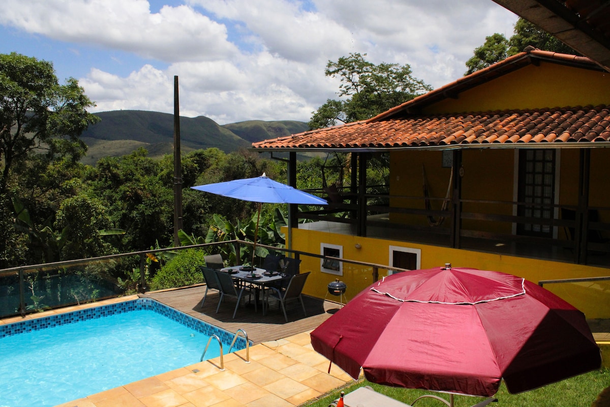 Bungalow med den beste utsikten over Serra da Moeda, enkel og koselig, unik overnatting på eiendommen, med gassoppvarmet dusj, trepanel, kjøleskap, terrasse med overdekket pergola. Dekket har en sjeselong, hengekøyer og et bord for å drikke vin mens du ser på solnedgangen eller fullmånen. Komplett kjøkken med komfyr og utstyr, bærbar grill. Serra da Moeda reiser seg foran hytta. Føl deg omfavnet av naturen som omgir stedet og inviterer deg til å slappe av og nyte øyeblikket!