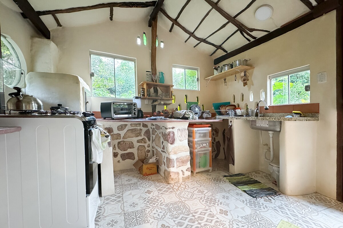 Kom og bo i et kunstverk med komfort og luksus midt i naturen. Huset ligger på et veldig rolig og trygt sted, 1 km fra det sentrale torget. Det tilbyr et kunstnerisk og sunt miljø med friluft, rent vann og økologiske frukter fra bakgården. Stedet og agroforestry og tilbyr tilgang til et vakkert, naturlig badehus, elver og fosser. Gratis trådløst nettverk, dobbeltboblebad, fullt kjøkken, solvarmer og økologisk behandling av alle rester. Vi tilbyr yoga og permakultur.