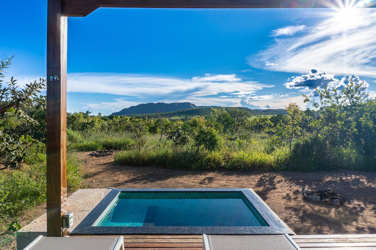Hytta vår er fullt integrert med naturen. Den har store glassrammer og en fri utsikt over Cerrado og fjellene, noe som gir en spektakulær utsikt. Fullt kjøkken, førsteklasses sengetøy og håndklær, flott oppvarmet dusj, skap og seng med 5-stjerners hotellmadrass. Det er en balkong med terrasse langs hele hytta, med bord og stoler ute slik at gjestene kan betrakte naturen og stjernehimmelen i Chapada – mens de drikker vin i boblebadet!