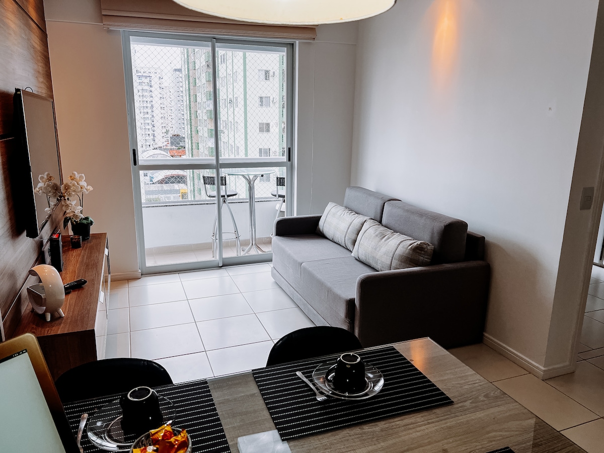 Funksjonell og veldig godt utstyrt studio, ideelt for de som søker komfort og funksjonalitet. Den har vaskemaskin og tørketrommel, klimaanlegg, smart-TV med Netflix og Prime Video, kjøkken og raskt trådløst nettverk – perfekt for både jobbreiser og øyeblikk med hvile. Utmerket beliggenhet: i Estreito, bare noen minutter fra sentrum av Florianópolis, ved siden av Florianópolis Hospital, Orlando Scarpelli stadion og Beiramar Continental. Designet for et praktisk og komfortabelt opphold. Med garasjeplass.