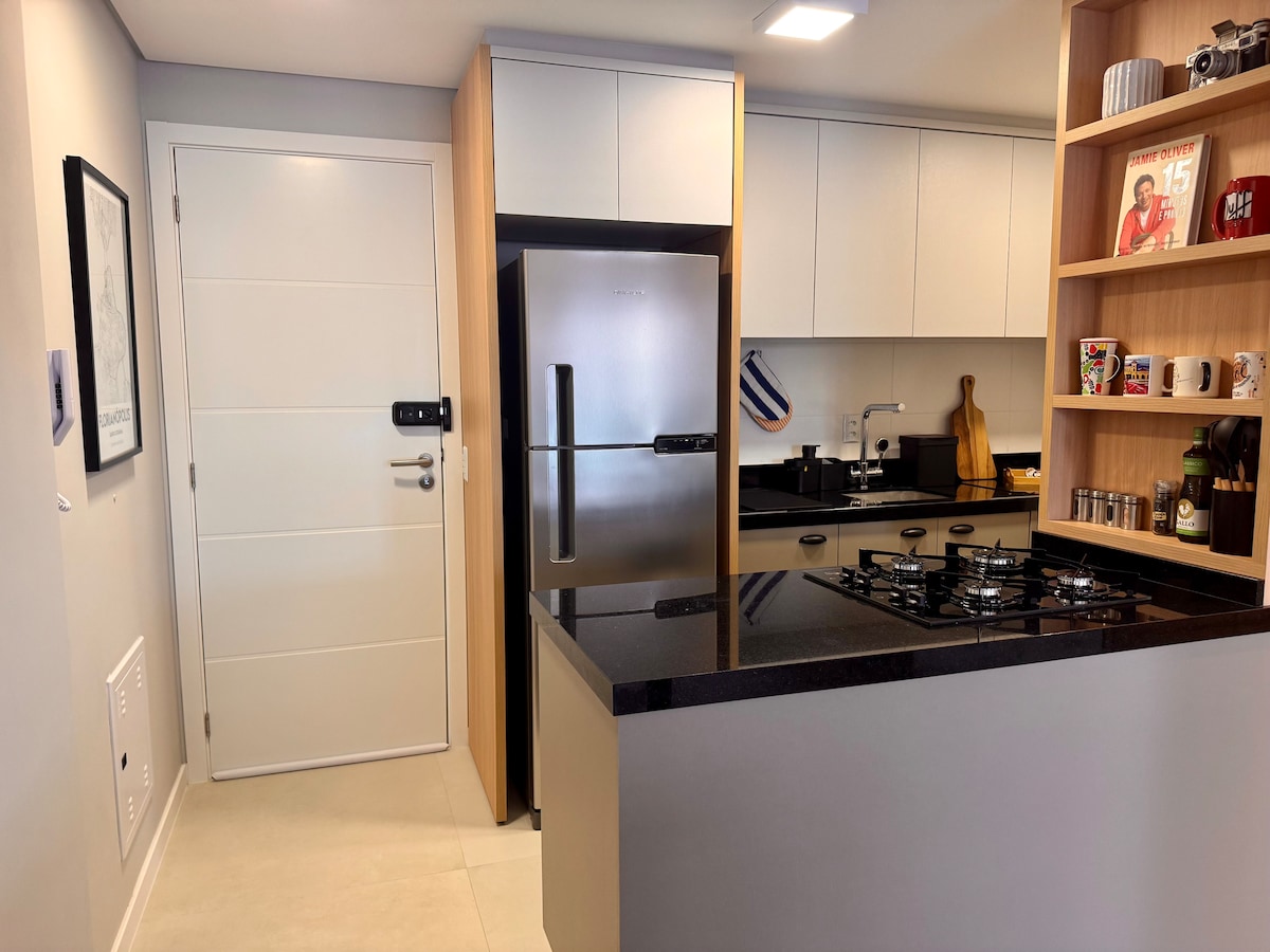 Helt ny, ideelt for de som reiser i forbindelse med jobb eller fritid, flott beliggenhet, 300 meter fra markedet og hovedgaten med flere restauranter, 10 minutter fra Floripas sentrum. Studioleiligheten er designet for å ta imot en person eller et par på en komfortabel måte. Trådløst nettverk, TV, kjøleskap, komfyr, mikrobølgeovn, kaffetrakter, vannkoker og grunnleggende utstyr for å tilberede måltider. Bygningen har også svømmebasseng, treningsstudio, heiser, kjæledyrsområde, vaskeri, individuell garasje.