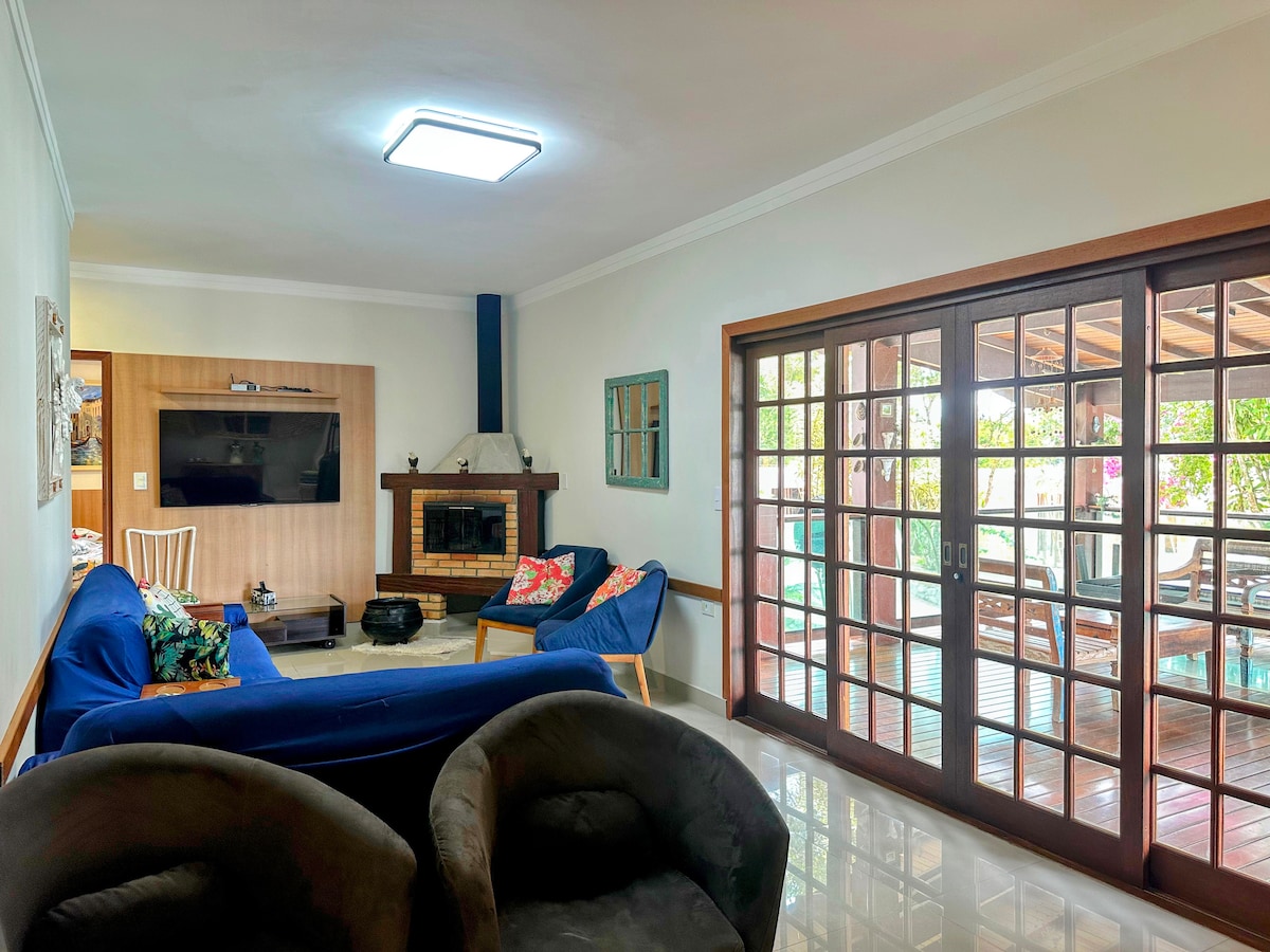 Perfekt hytte ved dammen. Ideell for dem som leter etter fred med familie og venner (maksimal kapasitet for ni personer). Hus med tre soverom (alle med klimaanlegg) og to bad (innvendig og eksternt), smart-TV, grill, ved, komplett kjøkken, trådløst nettverk. Svømmebasseng med vannkraft, lekeplass. Vi har flytende terrasse og demningsrampe, ta med båt, jetski eller kajakk. Vi er kjæledyrvennlige Lett tilkomst ved hovedveien Tamoios, nær Rosa Mística-kirken.