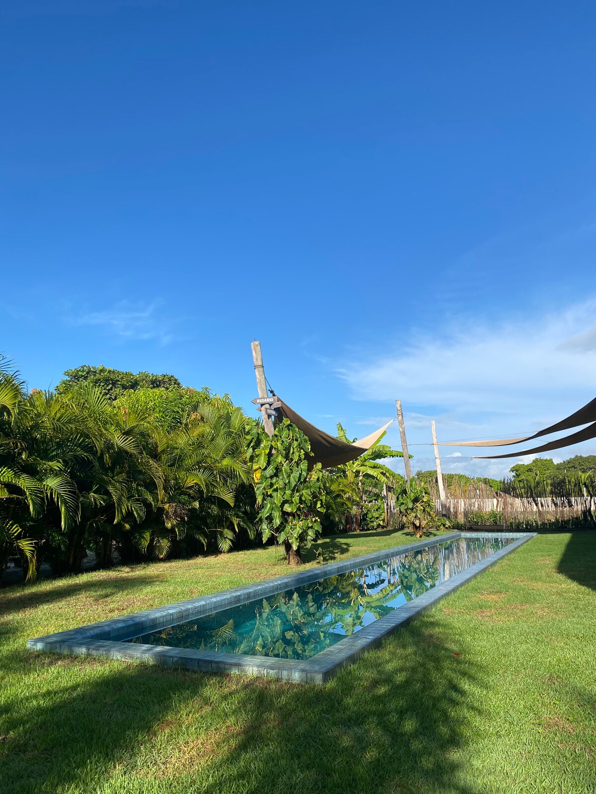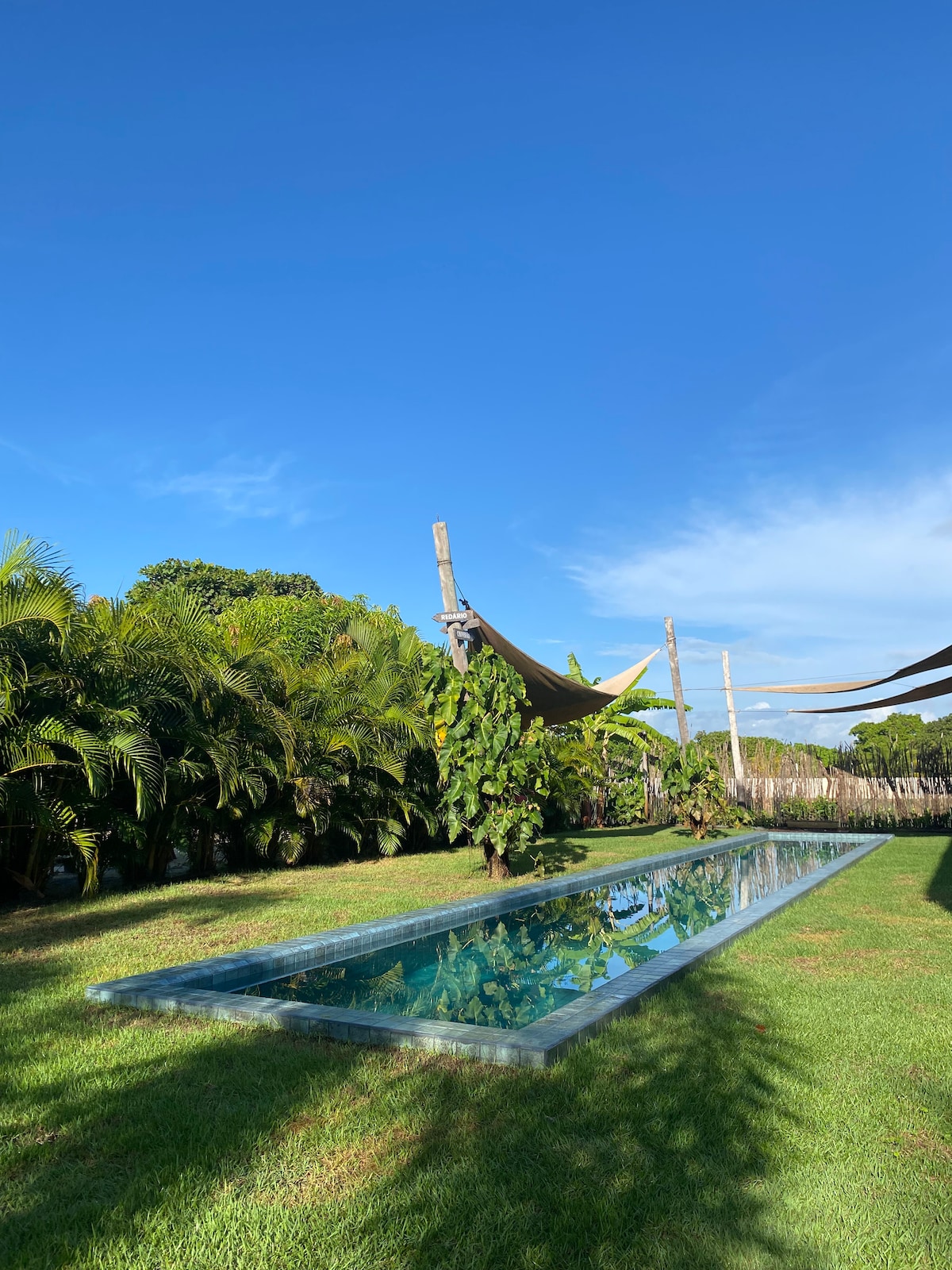 Nyt bassenget, den våte terrassen, utedusjen. Hagen på 800 kvm har vakre trær, plen og et sandområde som er ideelt for å nyte natten og stjernehimmelen. Bygg et leirbål, grill sjømat, dans måneskinnet. Totalt 150 kvm bygget areal med tre hytter/suiter, felles bad, kjøkken og parkering. Laget for å nyte dagen med all konstruksjon integrert i bassenget og hagen eller en koselig kveld.