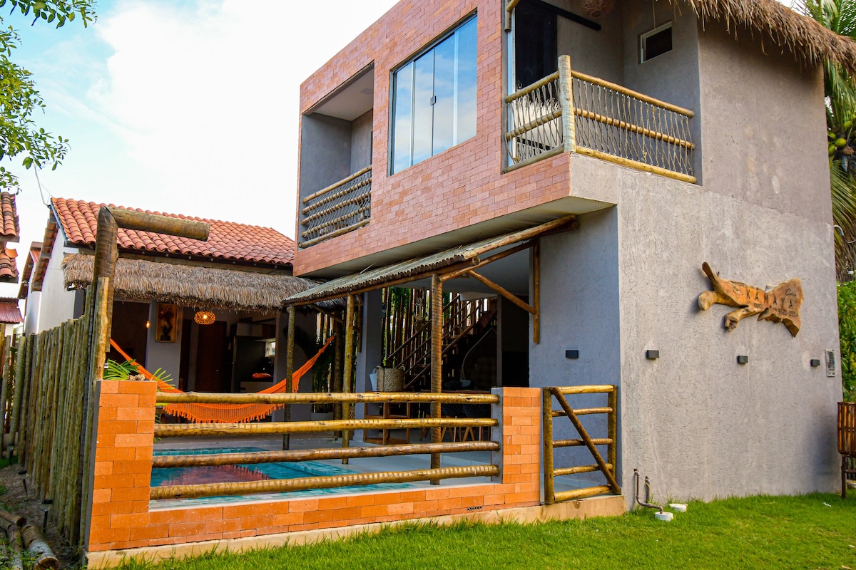 Plassert i en lukket selveierleilighet - MIRAKLER som står I AREIA - SJARMEHUS . Total sikkerhet og ro . Luksusbungalow med privat basseng. Ideell for bryllupsreise eller for deg som ønsker god smak og privatliv . Ligger ved havet i Praia do Toque, som er den beste stranden i São Miguel dos Milagres. Nabo til fantastiske restauranter. Jangadeiro fanger dem foran huset for å ta deg med på fantastiske spaserturer til de naturlige bassengene i regionen . Vi tilbyr frokost