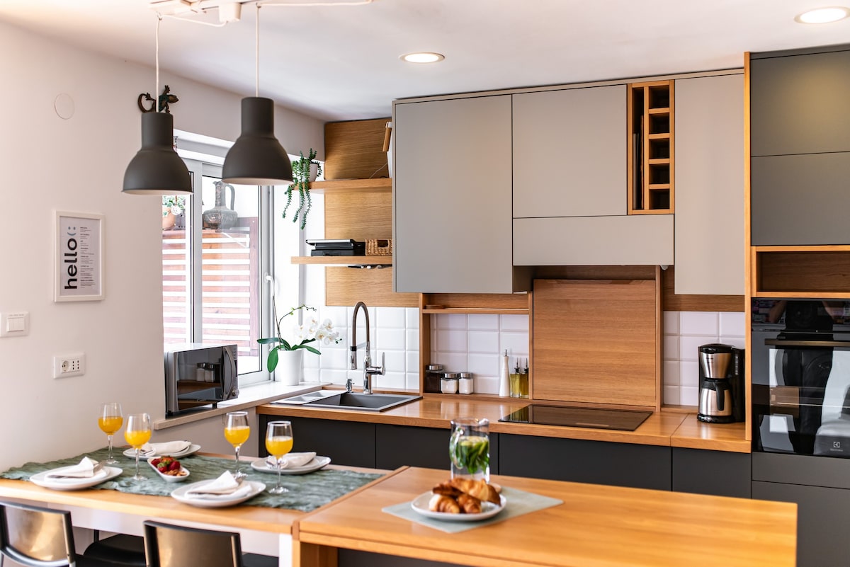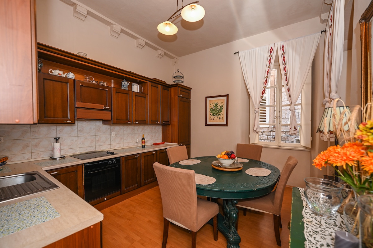 Denne moderne, romslige, lyse og koselige leiligheten ligger i første etasje i det tradisjonelle steinhuset i den mest ettertraktede delen av byen, kjent som Ploce. En hage med appelsintrær og en privat terrasse med spisestue, stue og solsengsområde, gir en fantastisk utsikt over Adriaterhavet og gamlebyen i Dubrovnik. Bare noen minutters spasertur fra gamlebyen, er leiligheten langt unna travle gater og støy akkurat nok til å være oasen av fred og ro.