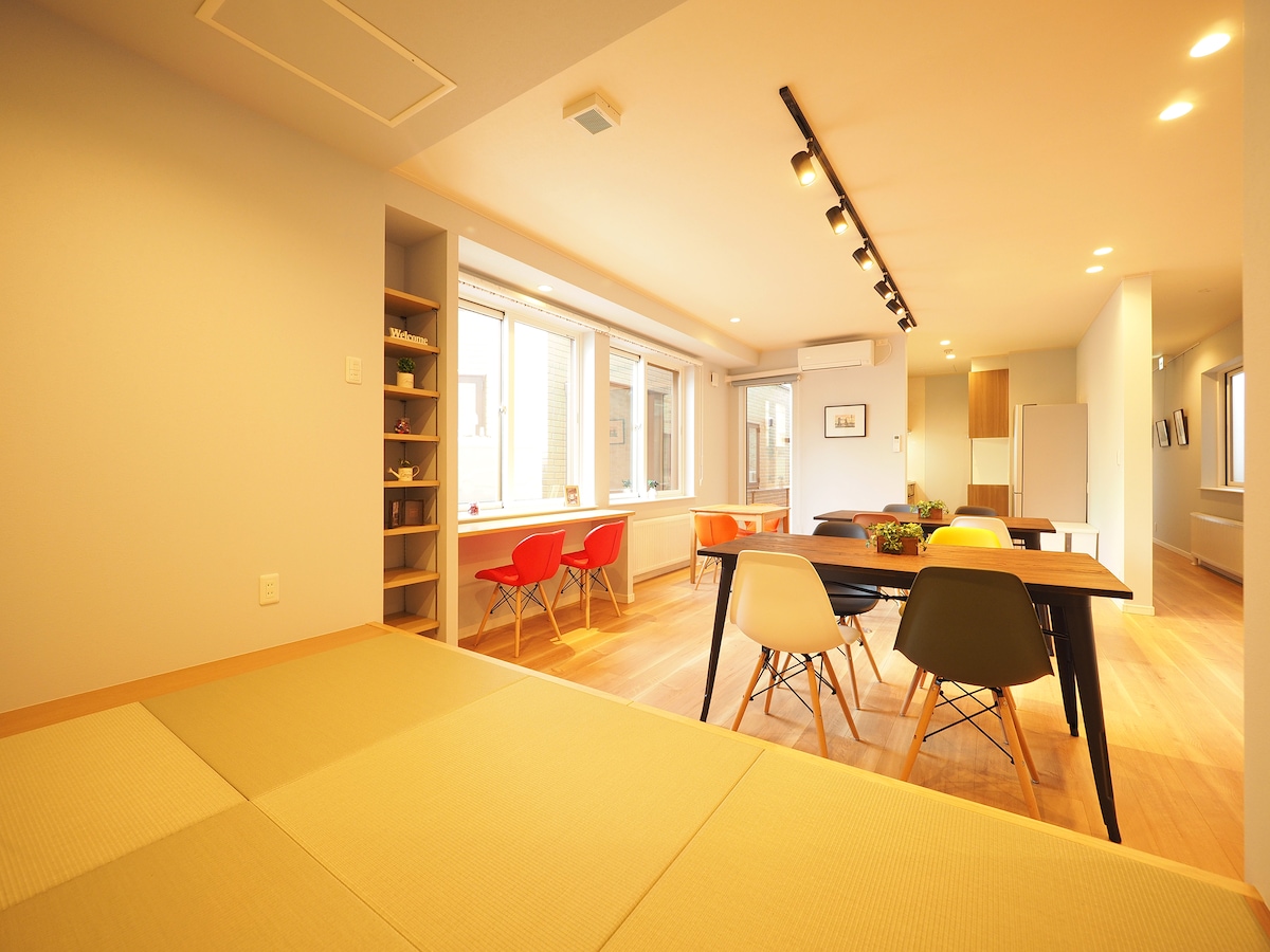 "FAMILIETRE" er et lite GJESTEHUS som ble nybygd i 2020 og ligger i nærheten av Nakajima Park. Det er kanskje ikke så praktisk som hoteller, men vi ønsker å gi en hjemmekoselig avslappende opplevelse! Det er fem minutters gange fra «Nakajima Koen Dori(中島公園通)» og «Gyokei Dori(行啓通)» -stasjonen (Shiden). Vi driver også en engelsk kafé og skole i nærheten av Sapporo stasjon. Så du er velkommen til å komme innom :) 中島公園からほど近く、2020年オープンしたばかりの小さなゲストハウス"FAMILIETRE"です. ホテルとは一味違うアットホームな空間を楽しんでください~ 市電「中島公園通」!行啓通」から徒歩5分です。