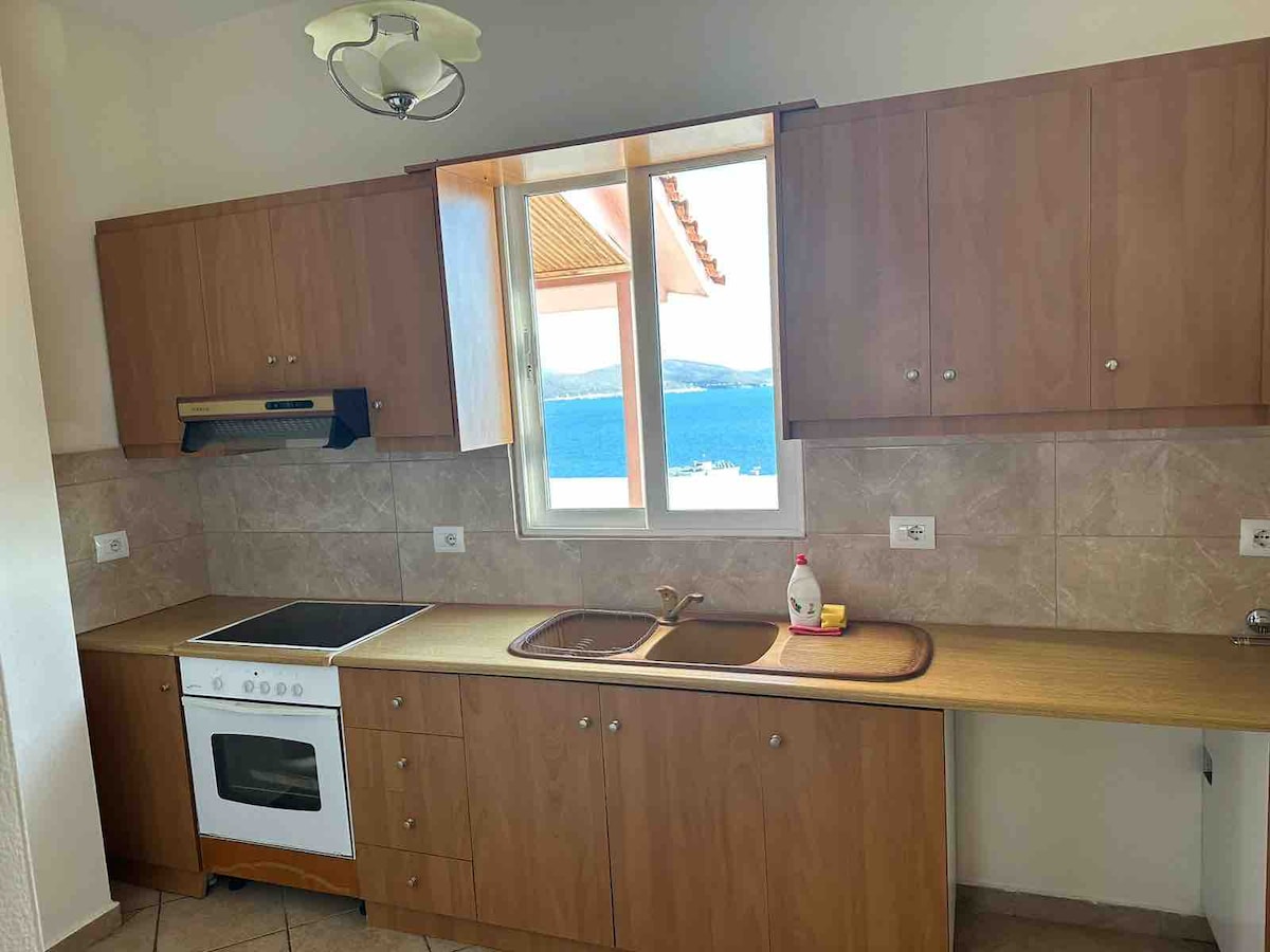 Den moderne, private og rolige leiligheten med fantastisk utsikt ligger på den beste beliggenheten i byen, Bougainville Bay. Stranden ligger rett nedenfor huset. Noen skritt unna er det strender med solsenger, strandklubber, en offentlig strand, bussholdeplass, supermarkeder, kaféer og restauranter. Du trenger ikke å bestige et fjell, og du kan enkelt gå. Den romslige balkongen har et spisebord med en veldig fin utsikt mot havet og Korfu.