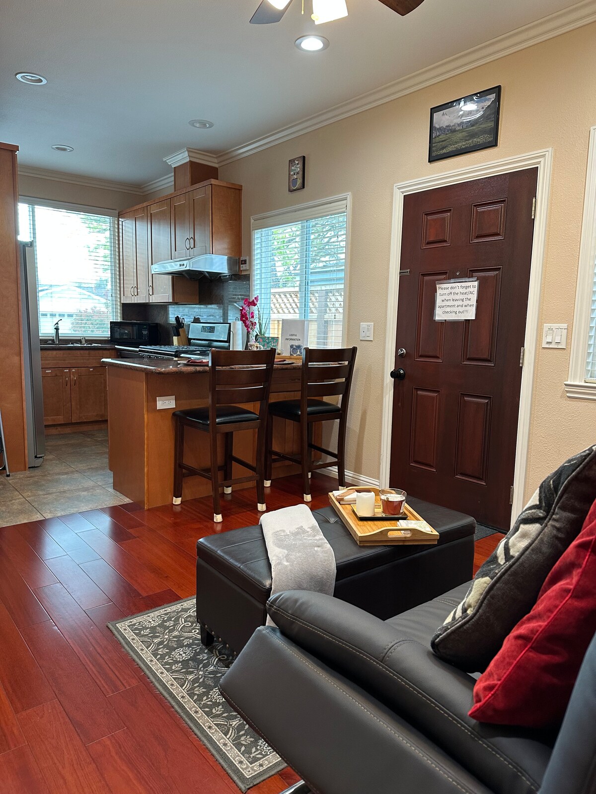 Romslig 2BR + privat kontor i et rolig nabolag som kan gås til fots. Fiber-Wi-Fi med over 600 Mbit/s, to private parkeringsplasser og et fullt utstyrt kjøkken. Bare tre minutters gange til seks restauranter, sju minutters gange til Cupertino Main Street og to minutters kjøring til Hwy 280 og Lawrence Expressway. Inkluderer to queensize-senger, smart-TV med strømming og en hage i bakgården. Perfekt for hjemmekontor eller et komfortabelt opphold i Bay Area.