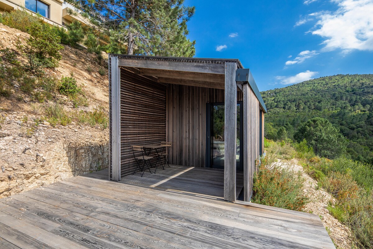 Vendt mot Aiguilles de Bavella, en luksushytte midt i maquis, U'Casella består av boligmodulen og en pergola. Det første volumet har plass til dusj og kjøkkentoalett, samt stue og soveplass med innrammet utsikt over naturen. Det andre volumet, pergolaen, er et ventilert og skyggelagt element som skaper et uteområde for ettertanke, lesing og hvile. En utendørs dusj gir en total fordypning i den omkringliggende naturen.