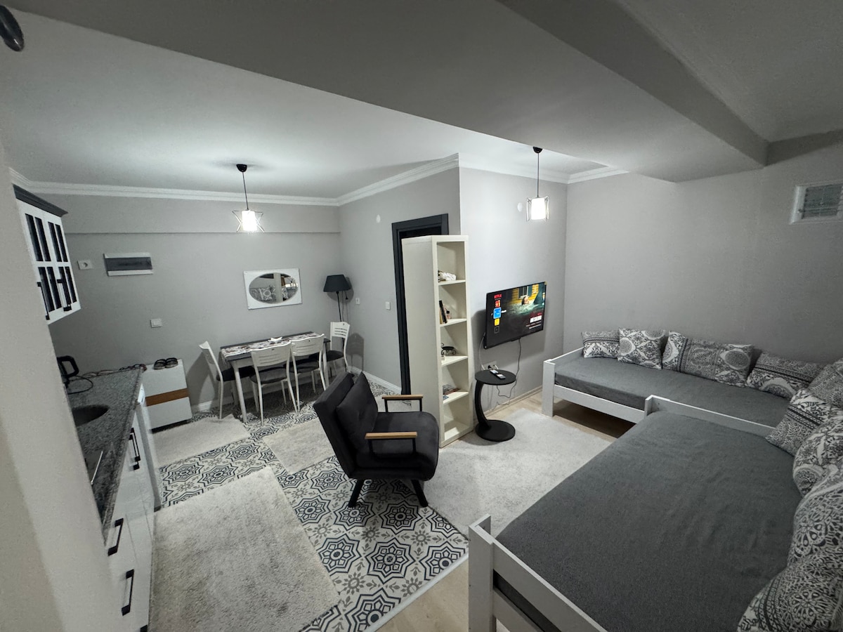 Det er en leilighet som passer for familier og par, 25 meter fra sjøen i sentrum av Mürefte. Det er ett dobbelt soverom med eget bad og et annet rom med en dobbeltseng. Det er et annet bad med vaskemaskin. Kjøleskap, oppvaskmaskin og alle grunnleggende kjøkkenutstyr er tilgjengelig på kjøkkenet. Balkongen med et bord for fire personer forbinder kjøkkenet og stuen. I stuen er det en sittegruppe for 2 personer, en for 3 personer, samt et rundt bord og en TV.