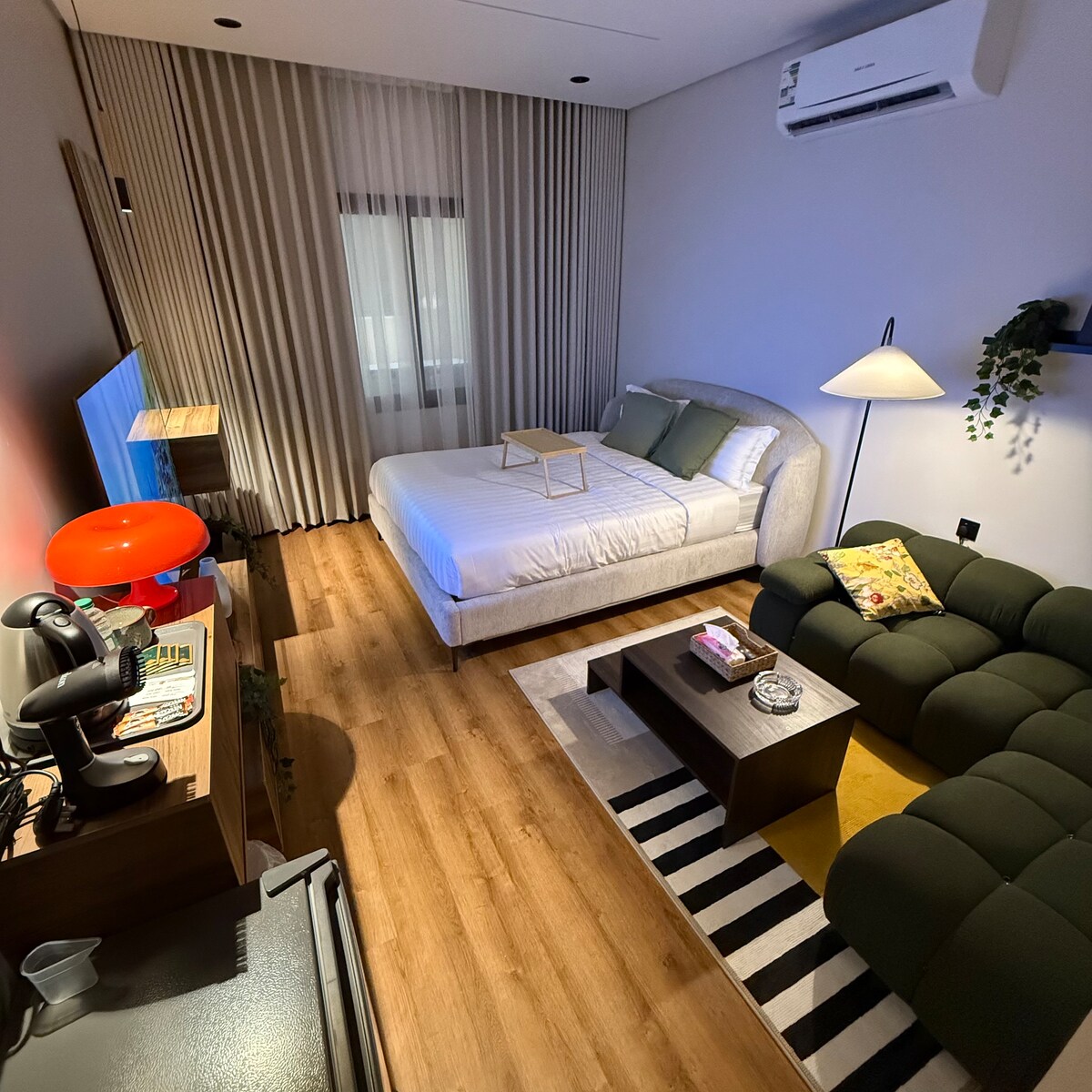 Luksuriøst studioleilighet med direkte utsikt over Bahrain Bridge og havet, strategisk plassert nær Shubaili Mall. Designet er elegant og stille, med varme farger og balansert belysning som gir en stilig hotellfølelse. Soveområdet er utstyrt med en luksuriøs seng og moderne innredning, med en skillevegg i tre som gir privatliv og et høyt design. Stuen er komfortabel med en skinnsofa og pelskjær som gir stedet varme, i tillegg til et ryddig arbeids-/prosesseringsområde med et LED-speil og innendørs planter som gir en atmosfære og en sofistikert karakter. Stedet er perfekt for de som ønsker komfort, privatliv og høy smak for en liten familie og reisende som leter etter en annen type overnattingsopplevelse og nær alle tjenester.