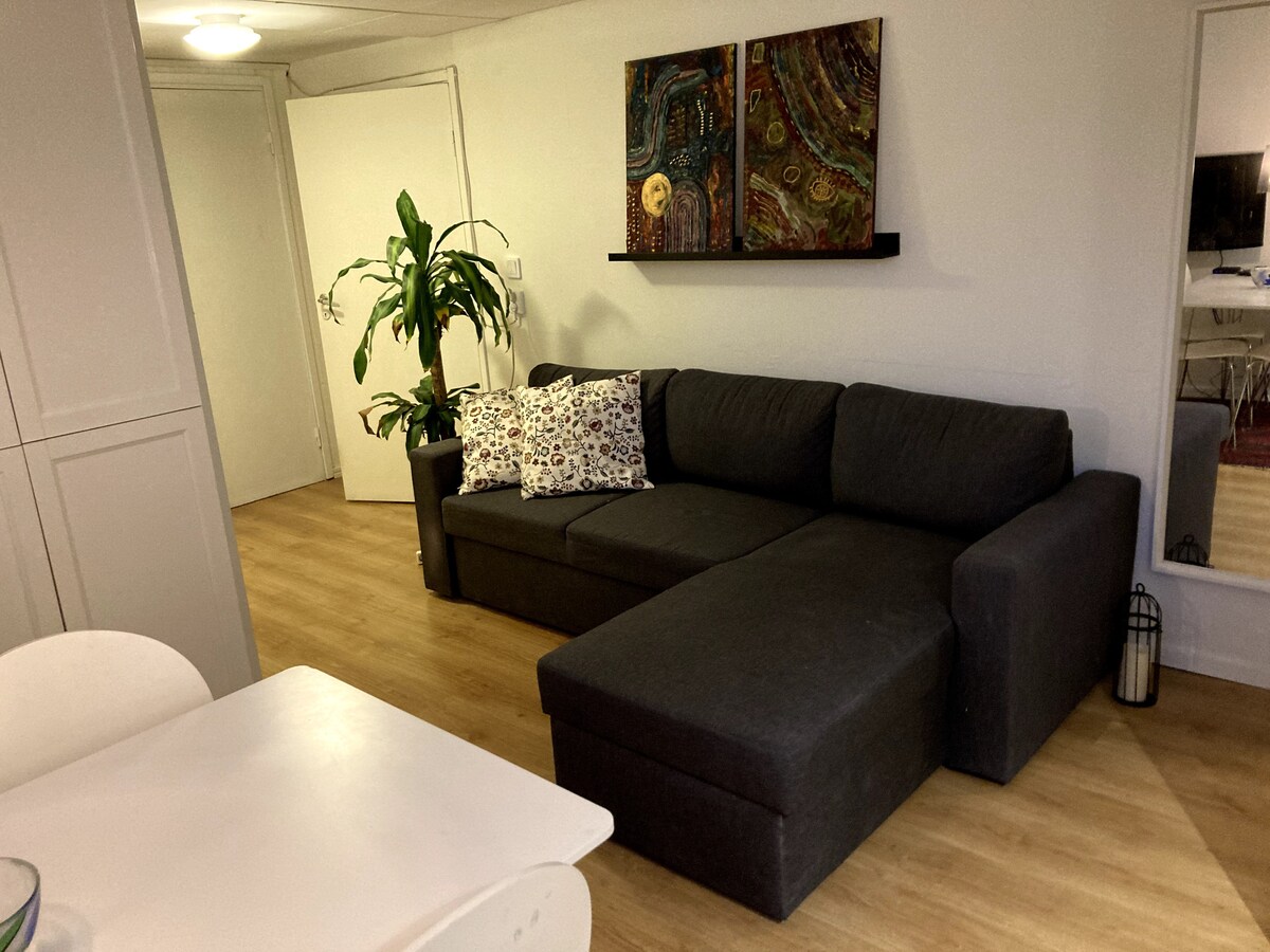 Fin kjellerleilighet med fire senger og sovesofa på kjøkkenet/stuen. Trådløst nettverk er inkludert. Huset ligger i et boligområde, i nærheten av ekspressbussen, ca. 20 minutter til sentralstasjonen. Ved siden av naturreservatet med fine turstier og en liten badevann 500 meter unna. Parkering på gata utenfor. Det er mulig å lade elbilen din på eiendommen vår mot et gebyr. Liten separat terrasse med plastbord og stoler. Kjæledyr er velkomne.