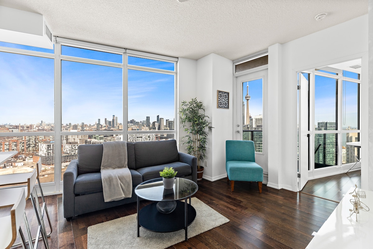 About the unit: ➜ Located 7 minutes from CN Tower, Metro Toronto Convention Centre, Rogers Centre ➜ Free secured parking for 1 car ➜ View of the lake / CN tower ➜ 24HR self check-in ➜ Over 800 ft² of space ➜ Walk score of 90 - Excellent! ➜ Transit score of 91 - Excellent! oms ➜ 2 bedrooms and 1 Full Bathroom ➜ Full sets of hotel quality bedding and fresh towels. ➜ Fully equipped kitchen with appliances including fridge and stove. ➜ In-suite washer and dryer