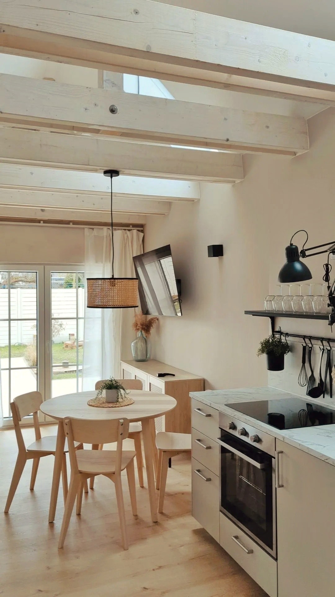 Den koselig innredede ferieleiligheten nås via en romslig trapp. En vestibyle gir mulighet til å oppbevare utendørs klær og sko. I inngangspartiet til huset er det en terrasse for å sitte ute. Utsikten er mot beite og eng. På fast grunn kan du grille (vær oppmerksom på skogbrannvarslingsnivået) eller drive med sport på den tilstøtende engen. Den rolige atmosfæren gir mulighet for mye avslapning.