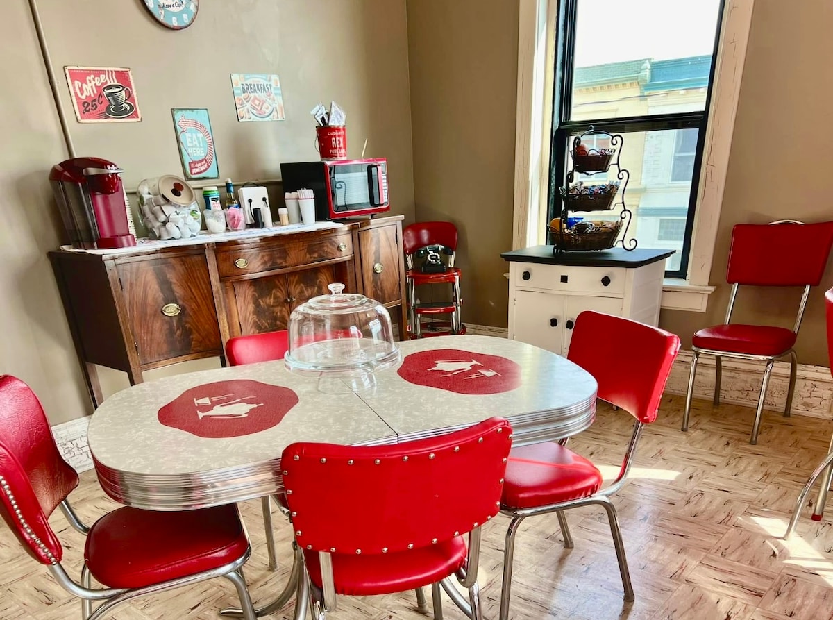 Denne historiske 1906 bygningen var skapt til å være det sentrale knutepunktet i milevis rundt. Det huset en mercantile & PO i 1. etasje & Dr's, advokater, tannleger i 2. etasje. Andre etasje ble gjenskapt i 2025 inn i en unik setting til hvor hver suite eller rom forteller en historie om den siste tiden. Fra 1860 til stede. "Hartung-suiten fra 1970-tallet", dristig, lyst, diskotek og rock & roll!
