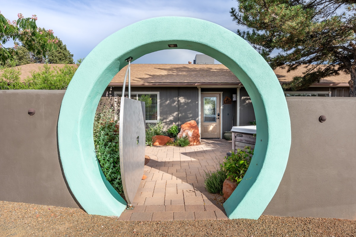 10/10 PERFEKT BELIGGENHET med utsikt ut nesten alle vinduer! Fantastisk historisk hjem i hjertet av Sedona. Tre soverom med delt planløsning - det tredje soverommet har en queensize-seng med en annen seng/uttrekkbar seng i lof. 2000 SF på 1/3 acre med boblebad, gangavstand til restauranter, shopping, og ligger rett ved siden av fantastiske Tlaquepaque (fem minutters gange) og bekken! Midt i alt, men føles veldig privat. Noen skritt fra Brewer Hiking Trail. Gratis Tesla-lader. Beste Airbnb i Sedona av AZ Insider.