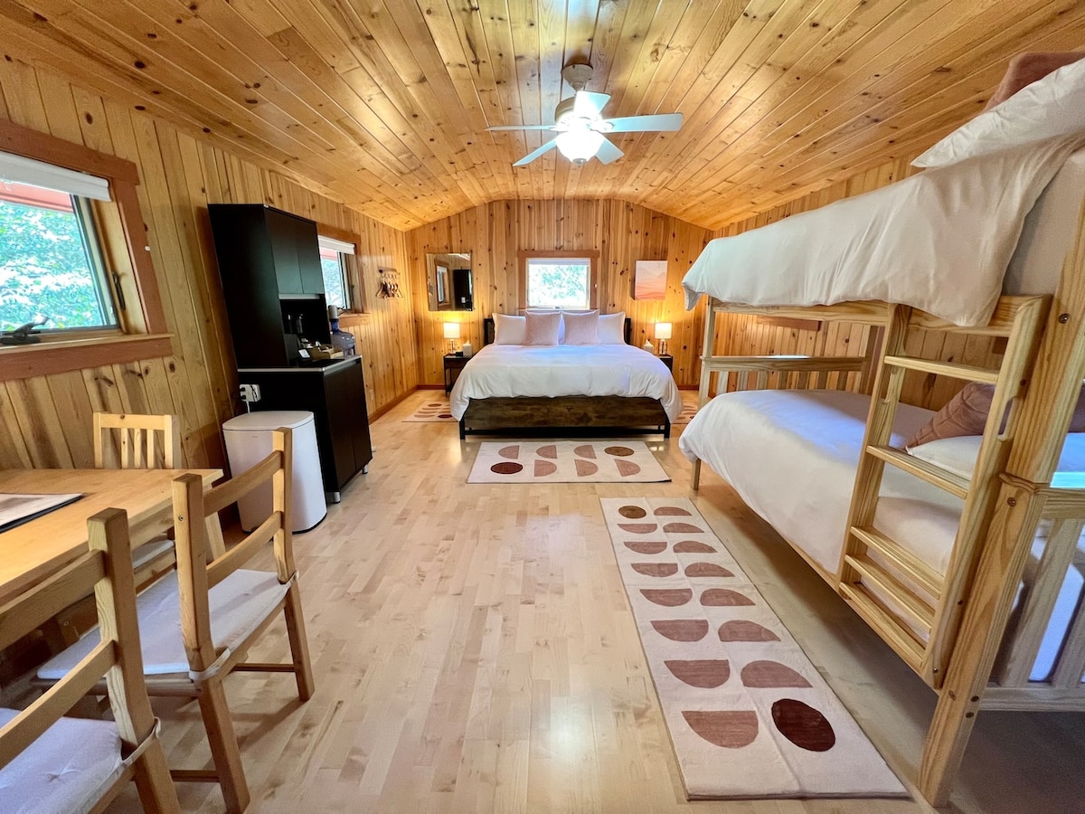 [Mandatory liability waiver signing upon arrival.] This 8-acre haven is not suitable for children under 18 due to the natural terrain, river access, and steep cliffs. NO DOGS (ADA only) Eagle Eye is a cedar sauna converted into a suite, perched atop a limestone cliff overlooking the enchanting creek, offering a unique and immersive experience like no other. With its concave window framing sunrise vistas, guests are treated to a cozy front-row seat to nature's spectacle.. Eagle Eye. 🦅👁️