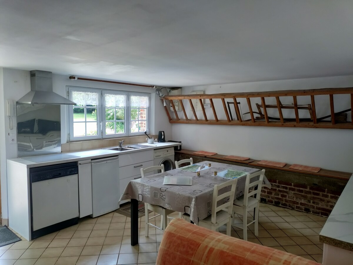 Studioleiligheten befinner seg i en gammel låve vi renoverte i 2014. Det er en del av et hus fra det 18. århundre i hjertet av normandy. Vi gjorde det koselig for å få deg til å føle deg som hjemme, siden vi bor i det om vinteren. På landet, veldig stille, har vi en stor hage som du kan nyte. I nærheten av Rouen, Dieppe og strender : 30 mn, Etretat 70 km, Calais to timer. Perfekt for par, også med baby. Stopp til souht, helger eller helligdager.