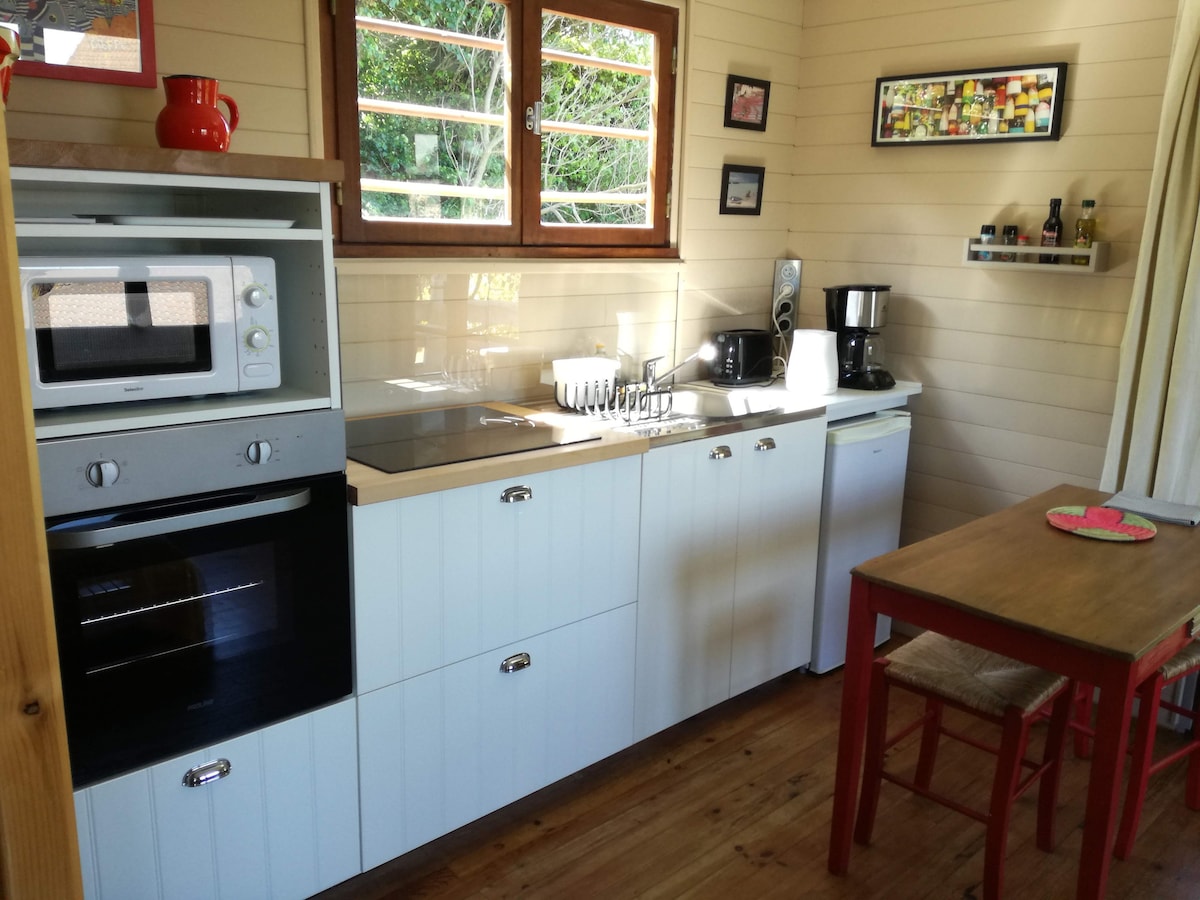 ET STILLE sted midt i en skogkledd hage i NATURLIGE OMGIVELSER. Denne avsidesliggende hytta vil fungere som et koselig rede med et soverom på loftet ovenpå, tilgjengelig med en stige. For ikke å nevne det fullt utstyrte kjøkkenet, badet og stuen med spiseplass og sovesofa. Gjester kan benytte seg av terrassen, hagen og det avslappende hjørnet i fullstendig privatliv, avhengig av årstiden. Utendørs fasiliteter er tilgjengelige for unge mennesker. VI SER FREM TIL Å VÆRE VERTSKAP FOR DEG!