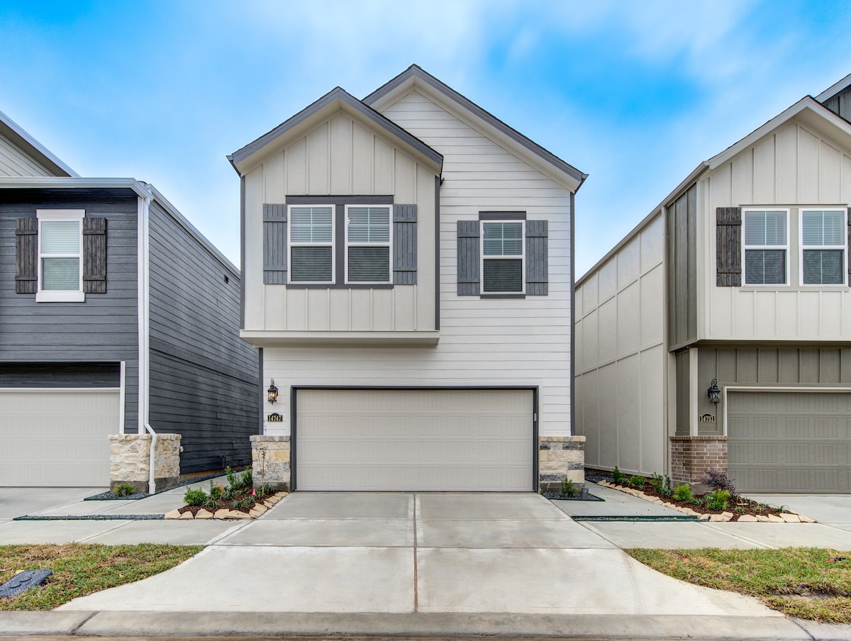 Helt nytt bygget hjem, parkside, enkel tilgang til Bellaire og Westheimer, 15 minutter fra Chinatown og Little Saigon, kjent for sine utrolige spisemuligheter og bekvemmelighet. Dette 1800sf-hjemmet har tre soverom, 2,5 bad, fire senger og plass til 12 personer. Nyt et fullt utstyrt kjøkken, komfortabelt sengetøy, smart-TV-er i alle rom, raskt trådløst nettverk, strømmetjenester, inkludert Hulu, Prime Video og MGM+, Luna+-spill og brettspill. Oppholdet ditt lover komfort, bekvemmelighet og et hint av lokal utforskning!