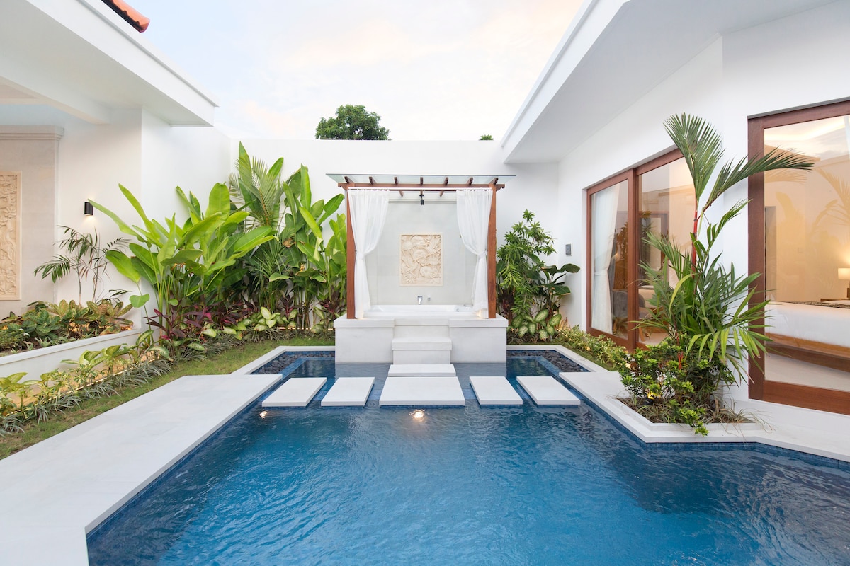 Villa Intan er en privat villa med to soverom som ligger 350 meter fra Seminyak-stranden. Villaen tilbyr privatlivet og fasilitetene til et feriehus uten å gå på akkord med fasiliteter og tjenester, som daglig rengjøring og frokost. Et privat basseng, et åpent oppholdsrom, et fullt utstyrt kjøkken, komfortable kingsize-senger, eget bad og en jacuzzi gjør villaen ideell for familier, par eller venner. Teamet vårt er tilgjengelig for deg hele dagen, og vi har en sikkerhetsvakt om natten.