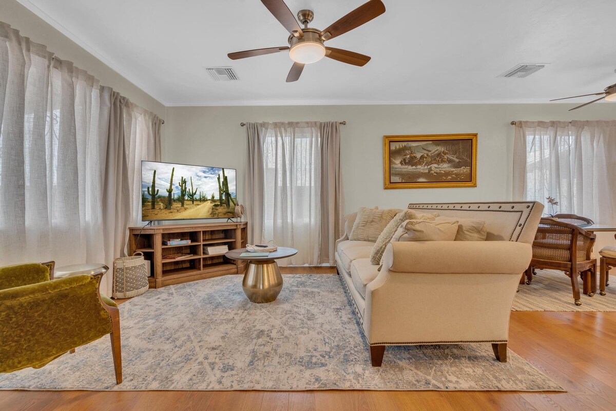 Start morgenen på verandaen med kolibrier som danser gjennom hagen, eller slapp av bak i skyggen av et palo verde-tre. Inne kan du nyte den luftige, solfylte stemningen i en moderne casita med varm sørvestlig gårdsstil. Bare ti minutters gange langs den nærliggende sykkelveien tar deg til lokale favoritter som Barrio Bread, og flere restauranter. Plassert i et rolig, sentralt nabolag i Tucson, bare fem minutter fra University of Arizona og 5–10 minutter fra sentrum.