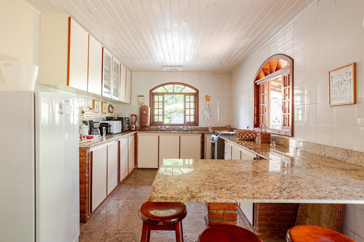 Det ligger i Petrópolis, 18 minutter fra Itaipava-slottet, og er omgitt av natur. Den har fire soverom med klimaanlegg og tre bad, samt et godt kjøkken, en stor veranda, et gourmetområde med grill, bordfotball og biljard. Uteområdet har et svømmebasseng, innsjøer, to trampoliner, en fotballbane, hager, trær, en grønnsakshage osv. Dette området deles med gjester i det andre huset – Casa do Jardim (https://airbnb.com/h/casajardimquintadapedra). Vi aksepterer kjæledyr.