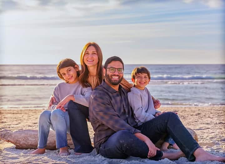 En morsom familieportrettøkt i en tidløs setting: Carmals berømte hvite sandstrand.