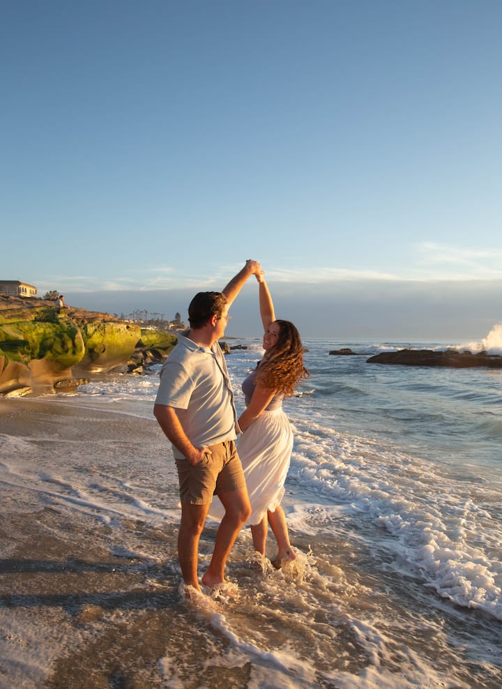 En portrettøkt i enten Ocean Beach, Pacific Beach eller La Jolla. Minst 20 bilder leveres til deg innen 24 timer etter fotograferingen.