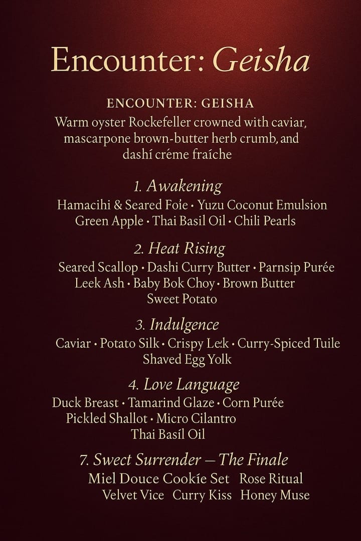 Savor Sunday er en oppslukende Supper Club-opplevelse. Møt geisha – en feminin opplevelse. Intim syvrettersreise gjennom sensuelle smaker, ritualer og gjenfødelse. Hver tallerken forteller en historie – om balanse, dristighet og skjønnhet. Bli med meg når vi feirer kvinnelighet gjennom mat, følelser og flyt.