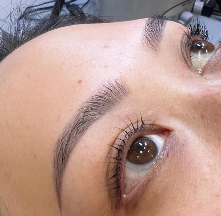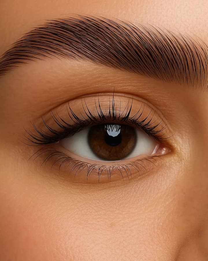 Øyenbrynene er laminert for en elegant, løftet form. Øyenvipper får et LVL-løft og farge for volum, lengde og definisjon.