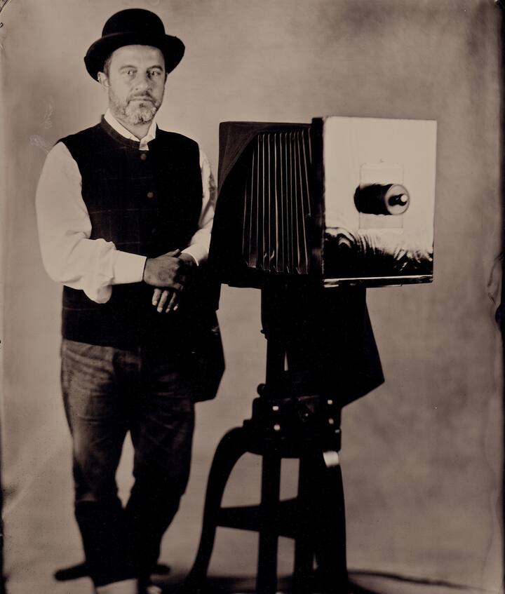 Egnet for opptil tre personer. Opplev en oppslukende våtplatekollodion-portrettøkt, inkludert en introduksjon til historien om tidlig fotografering. Gjester kan velge å bruke tidsriktige klær. Du følger hele prosessen, fra oppsett av storformatkamera og forberedelse av plater til fremkalling under rødt sikkerhetslys i mørkerommet. Eksponeringen varer i noen sekunder. Du får en unik håndlaget ferrotypi på metall, laget ved hjelp av en autentisk prosess fra det 19. århundre.