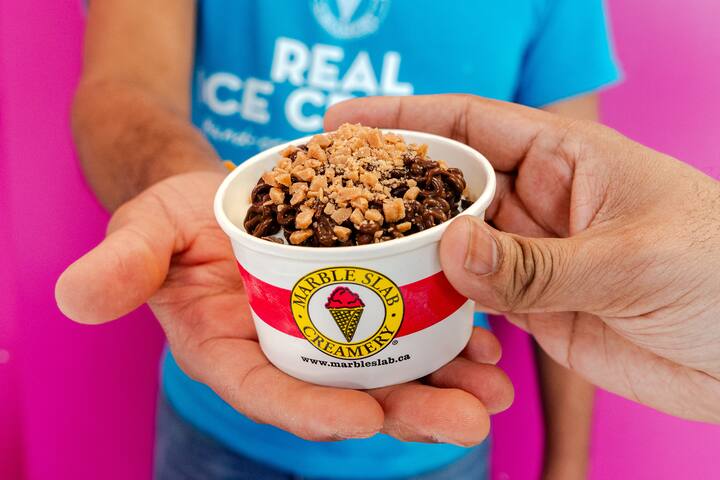 Vi setter opp en iskremstasjon på stedet ditt der gjestene kan velge favorittsmakene sine og lage sine egne kreasjoner med et bredt utvalg av førsteklasses topping – alt blandet ferskt på en iskald marmorplate.