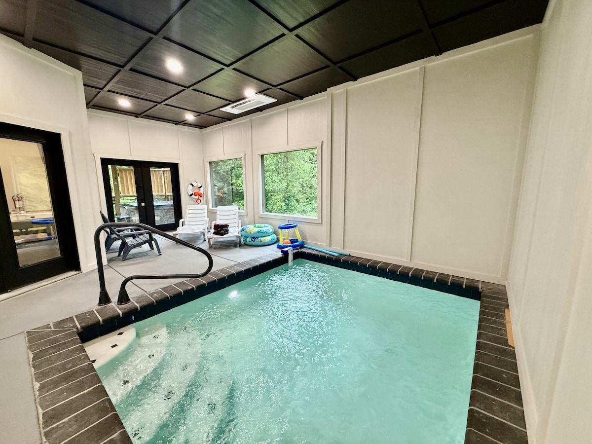 Welcome to our stunning, newly built 3 bedroom cabin, with an indoor pool/ hot tub. Nestled in a secluded community, with beautiful tree line views, this modern oasis offers privacy and relaxation! Nothing was spared in creating a fun and relaxing environment for friends and family to enjoy. Top of the line flat screen TVs, as well as Sonos audio to enjoy your favorite tunes no matter where you chose to relax. The game room has Air Hockey, a multi game console, and corn hole for tons of fun!